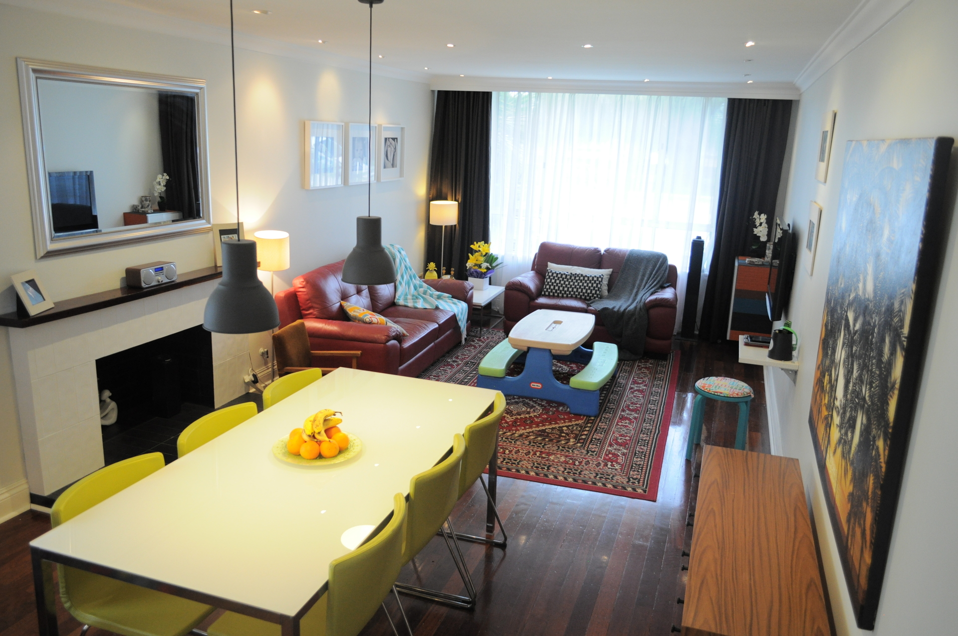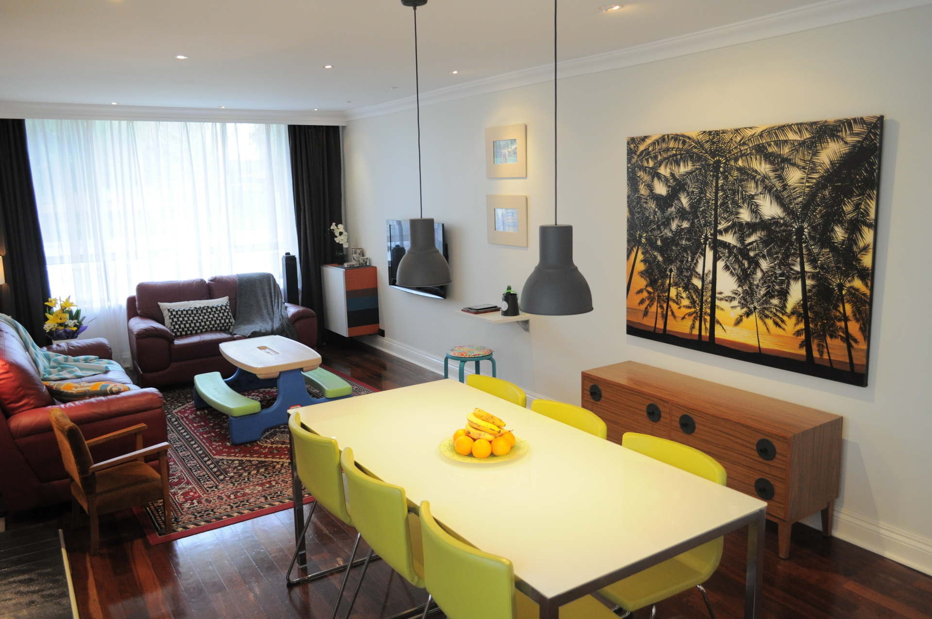 + This room flows on to the meals with pendant lighting over the dining table.