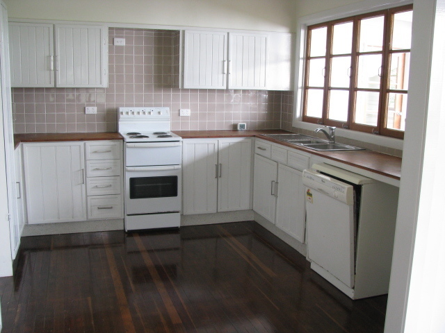The country style kitchen with new dishwasher has lovely bay windows which open on to the rear covered deck overlooking the large leafy back yard.