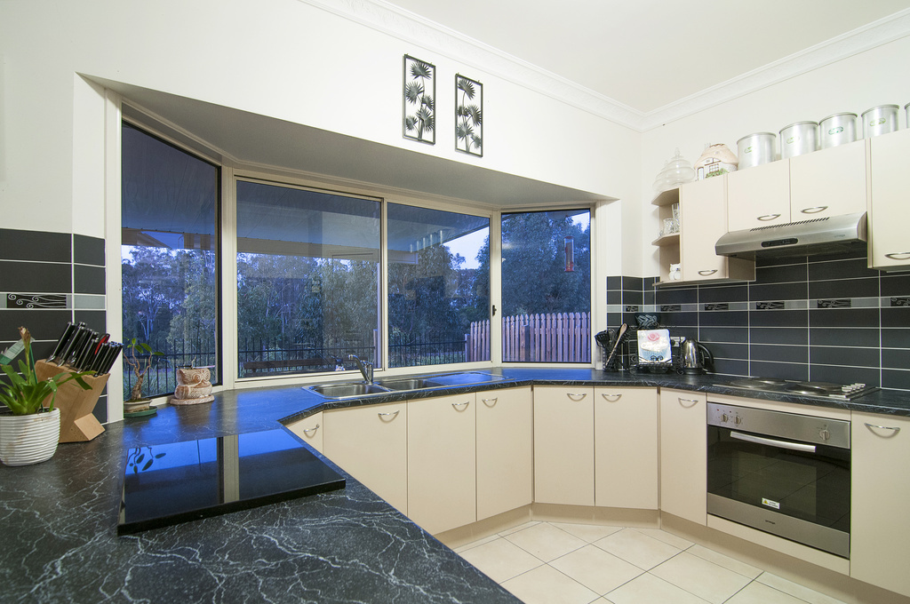 * Large bay kitchen windows overlooking the outside decked entertainment area and parklands beyond