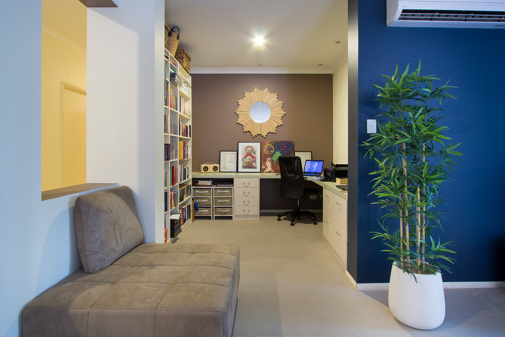 • Separate study with built-in wraparound desk, drawers & huge bookcase - perfect for running a home business or a place for kids/adults to study