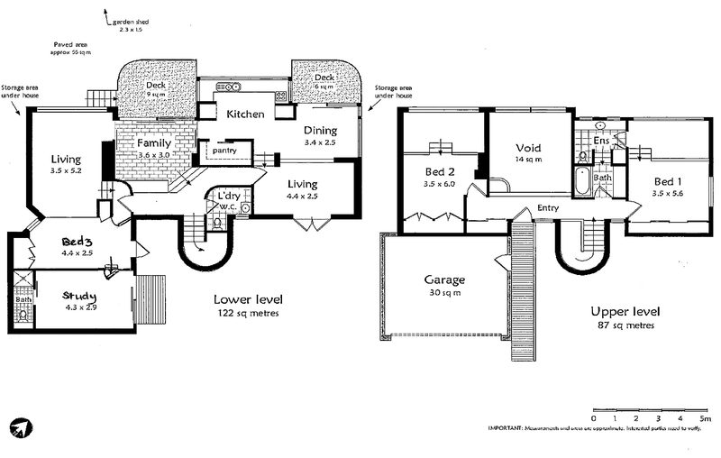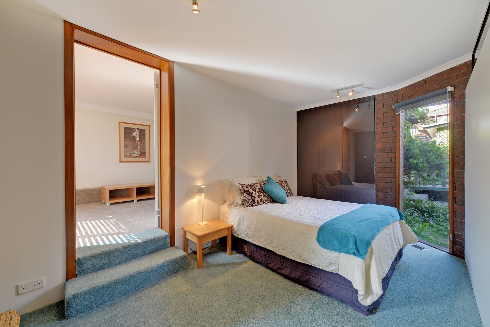 A separate lounge room with double glazed windows creates a feeling of comfort and privacy. The adjacent third bedroom and study has access to the courtyard and separate toilet and shower. Two spacious bedrooms are found on the upper level; the bathroom having dual access for convenience.