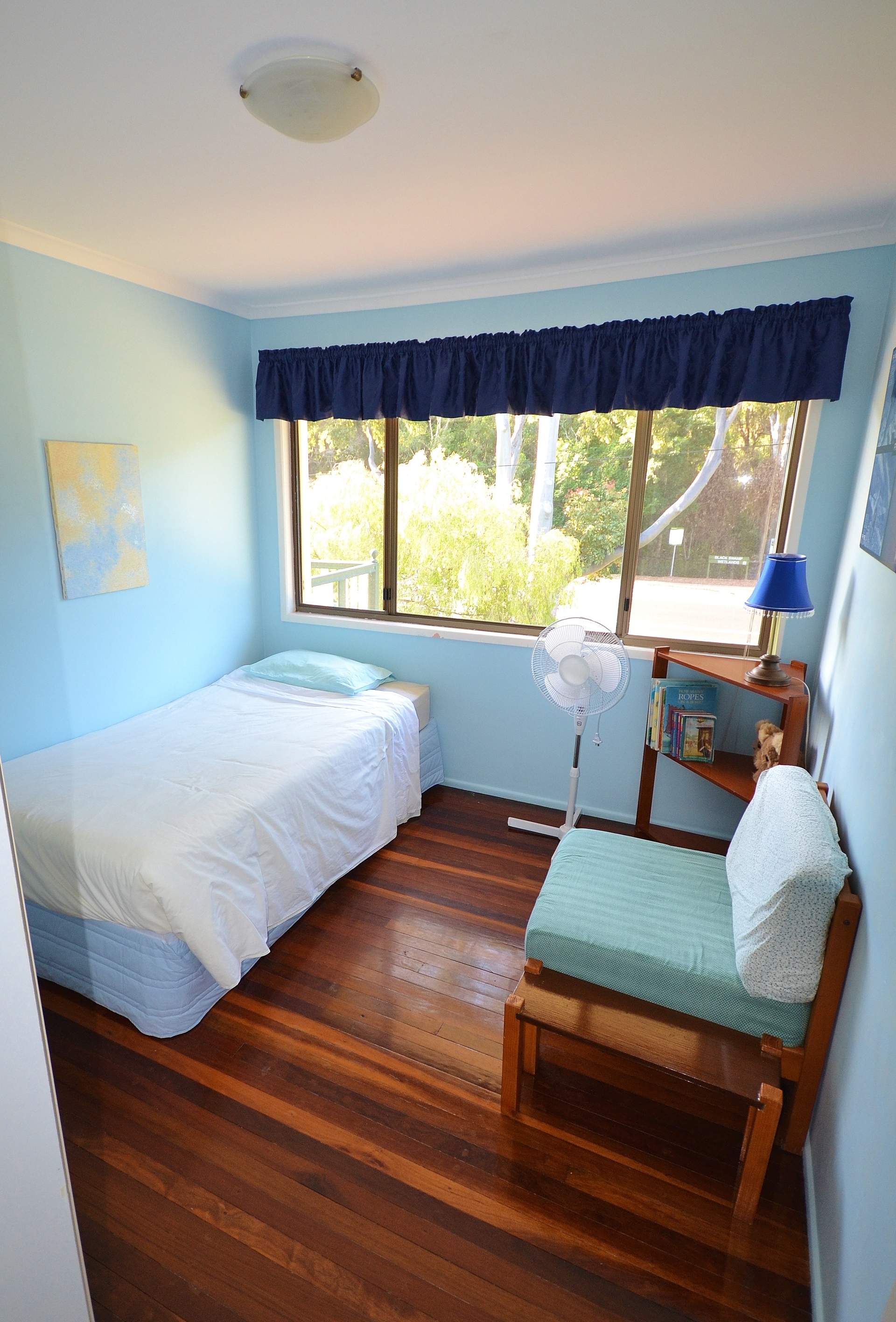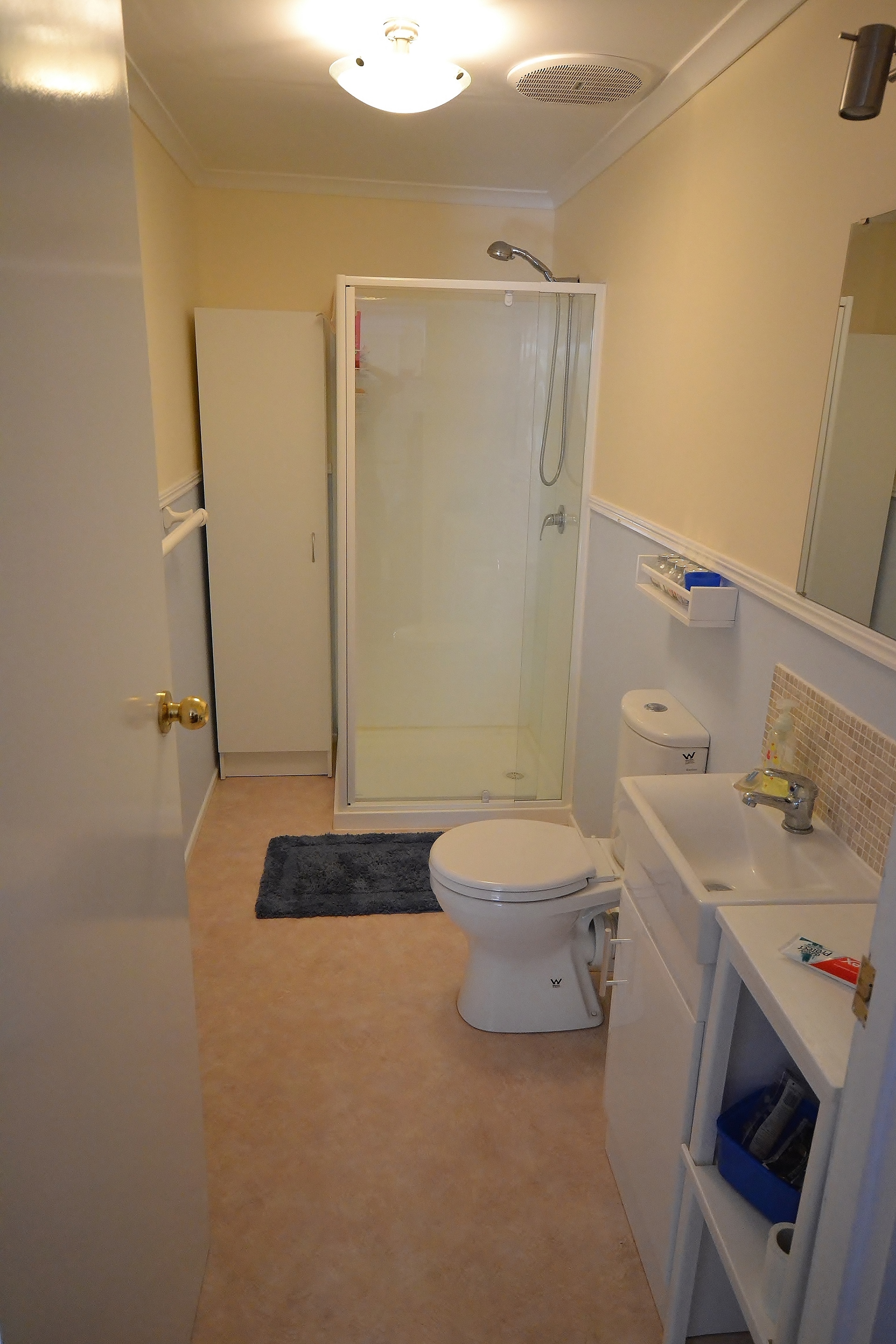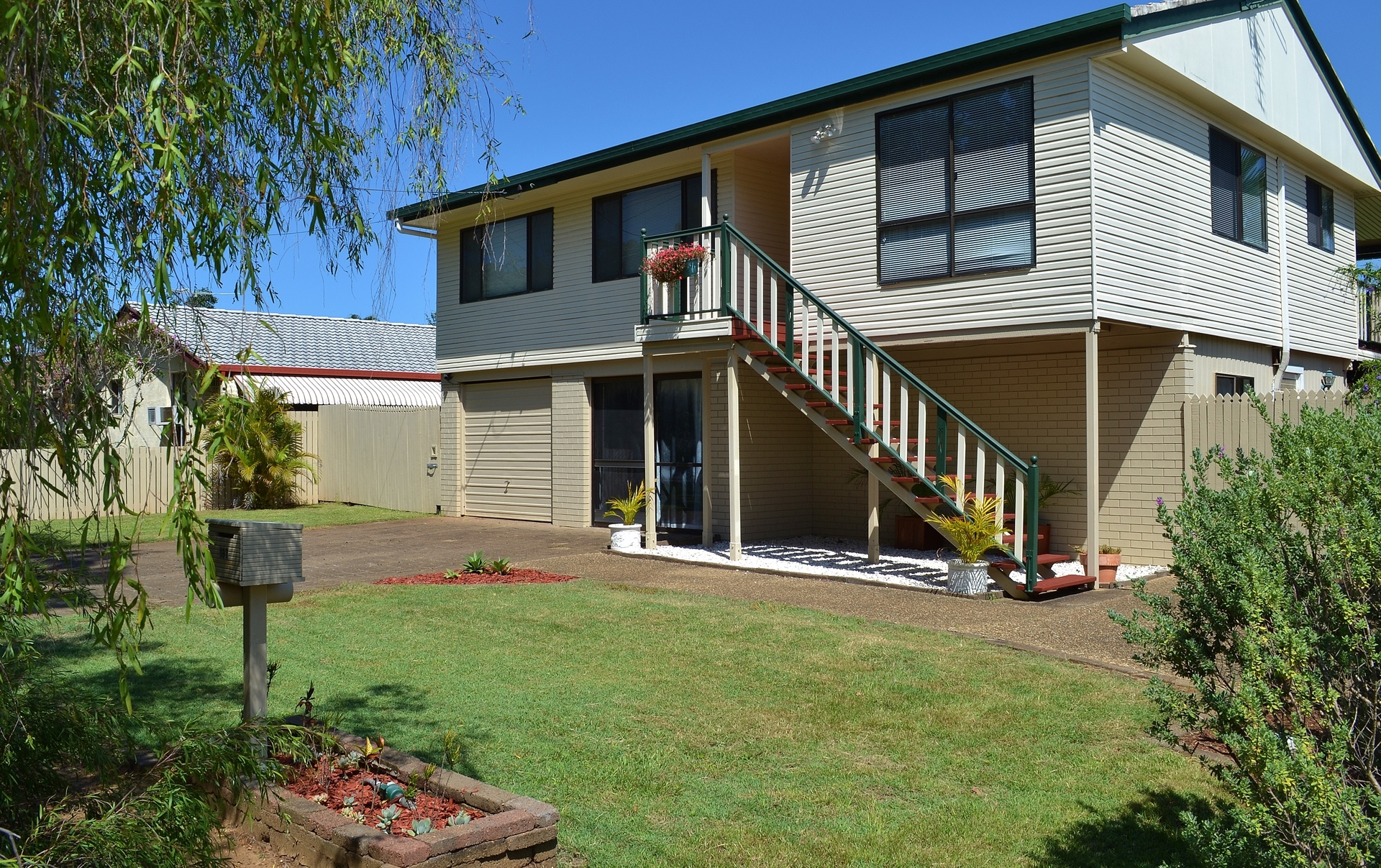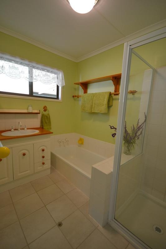 Downstairs, there is a generous tiled space with a shower and toilet. There is a single car garage and an extensive paved, shaded outdoor area. There are two split system air conditioners (one upstairs, one downstairs), which make this house comfortable all year round.