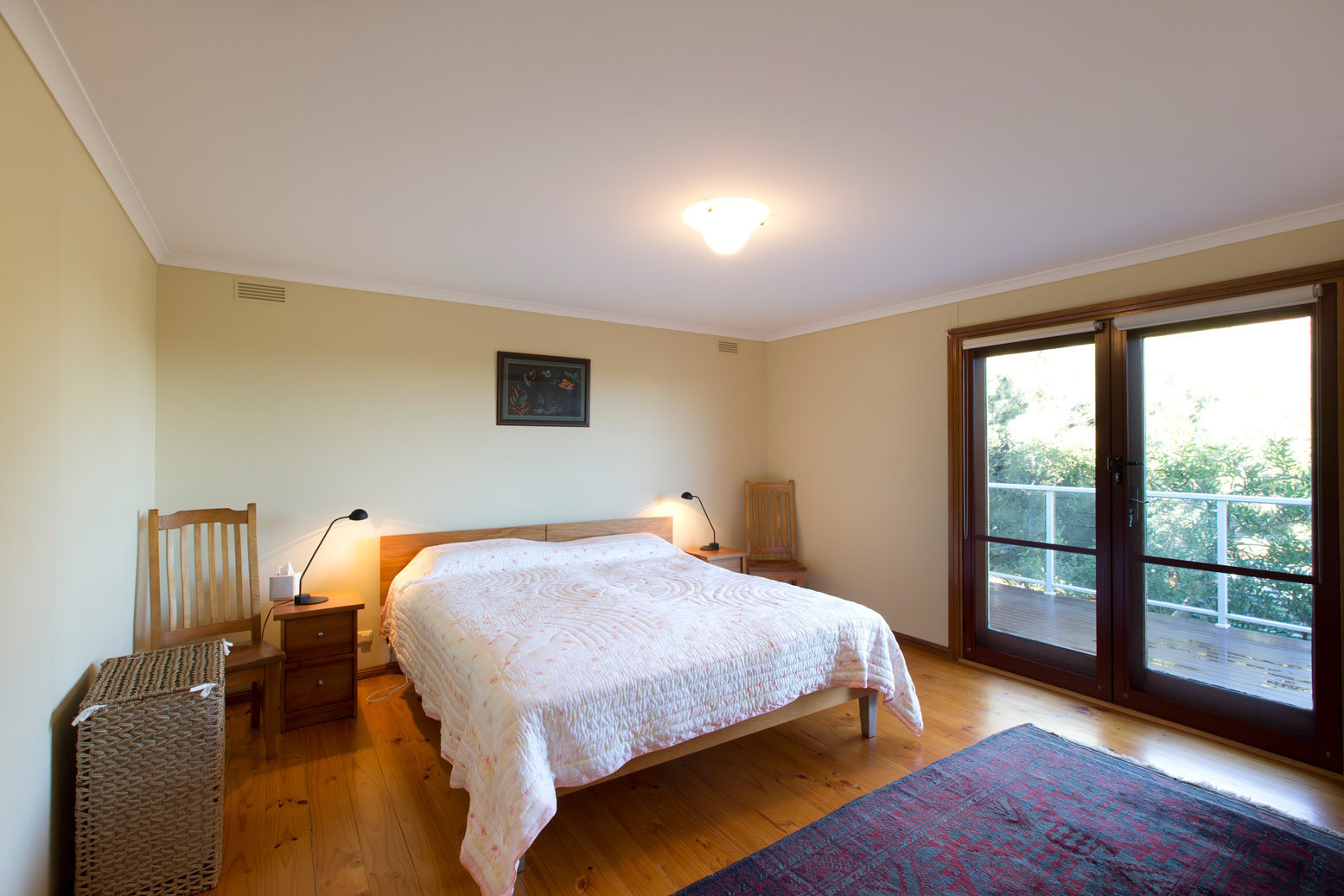 UPPER LEVEL: Entry, open plan lounge/dining/kitchen, 2 bedrooms, bathroom and expansive decks on 3 sides, with a covered outdoor dining area.