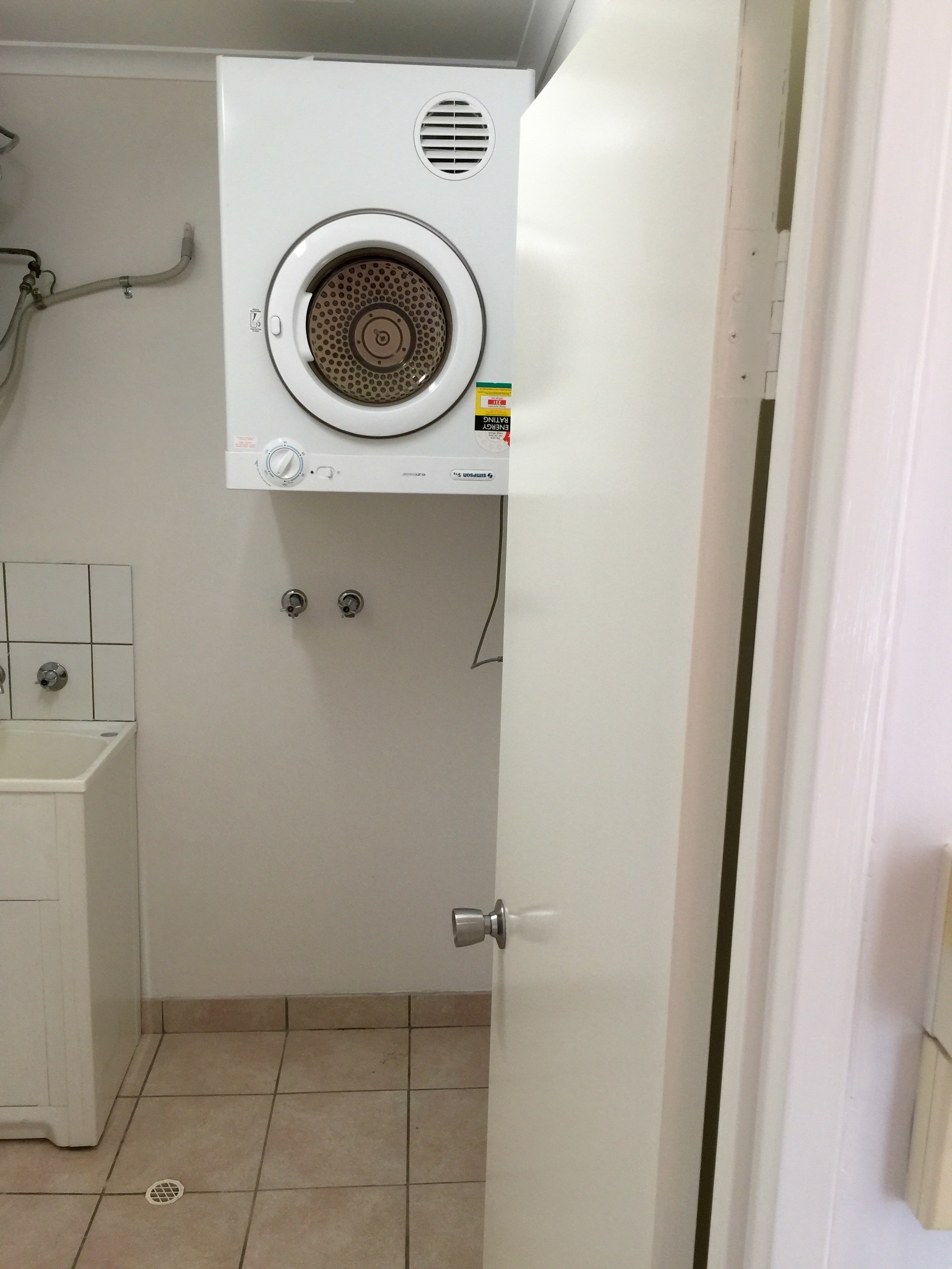 A separate laundry room contains more storage and a wall mounted Fisher and Paykel clothes dryer.