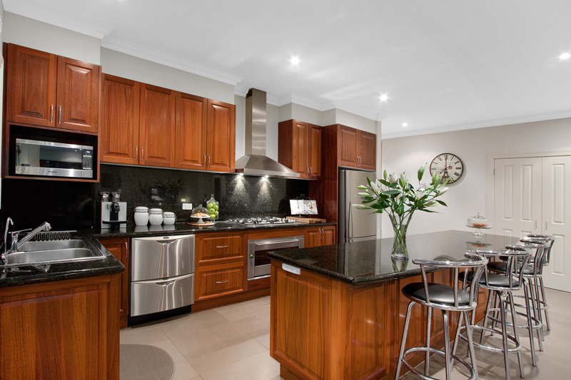 Refined elegance continues in the fully appointed hostess kitchen featuring 45mm granite benchtops, island bench and splashbacks, stainless steel twin draw dishwasher, double pantry, amazing cupboard storage, 900mm SMEG oven, gas cook top and range hood.
