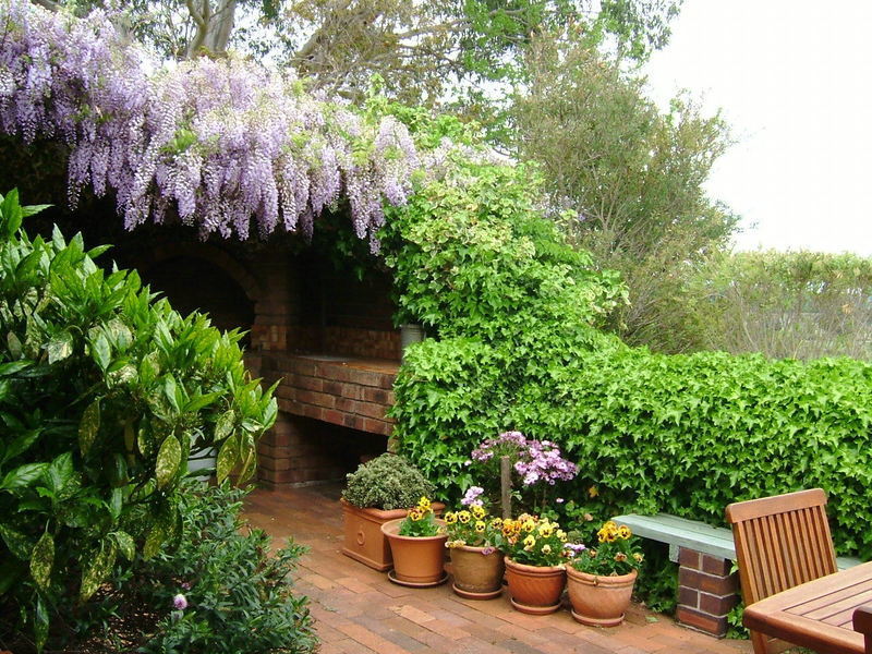 * built-in BBQ within lovely walled entertaining courtyard, with views over pastoral valley to the city