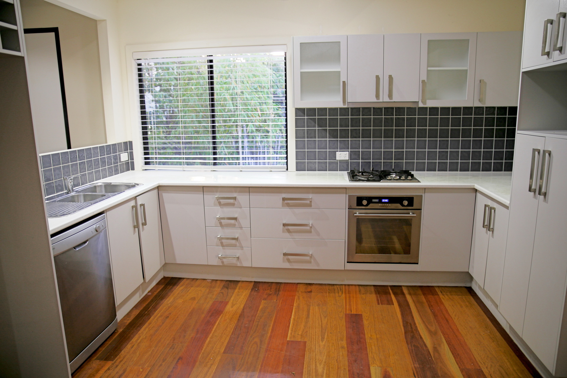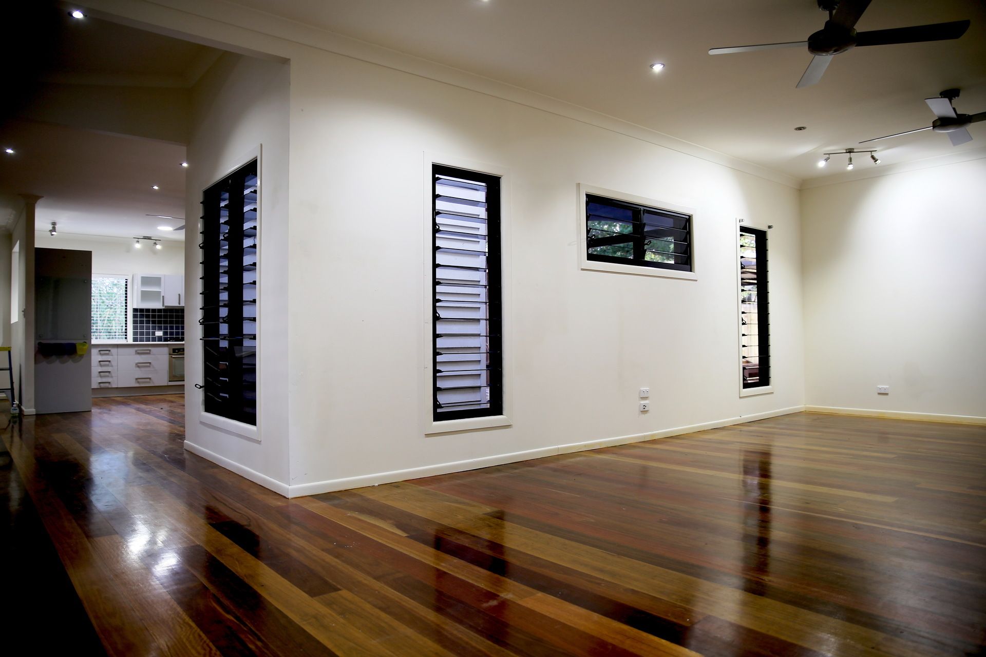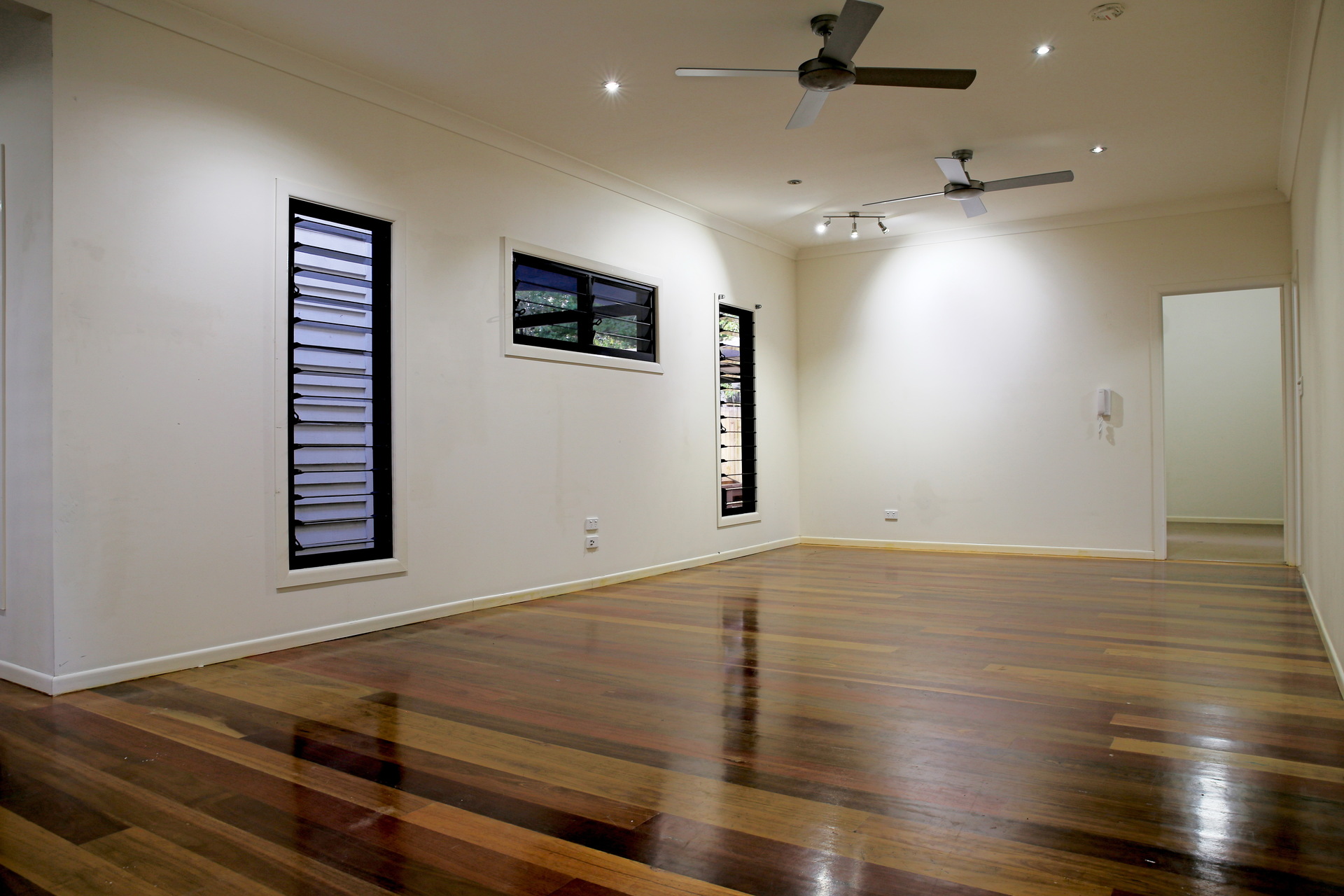 Polished wooden floorboards in living areas, carpet in bedrooms.