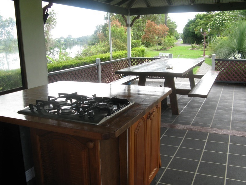 Large outdoor entertainment area with kitchen and refrigeration, 2nd gazebo, both with extensive property and river views.