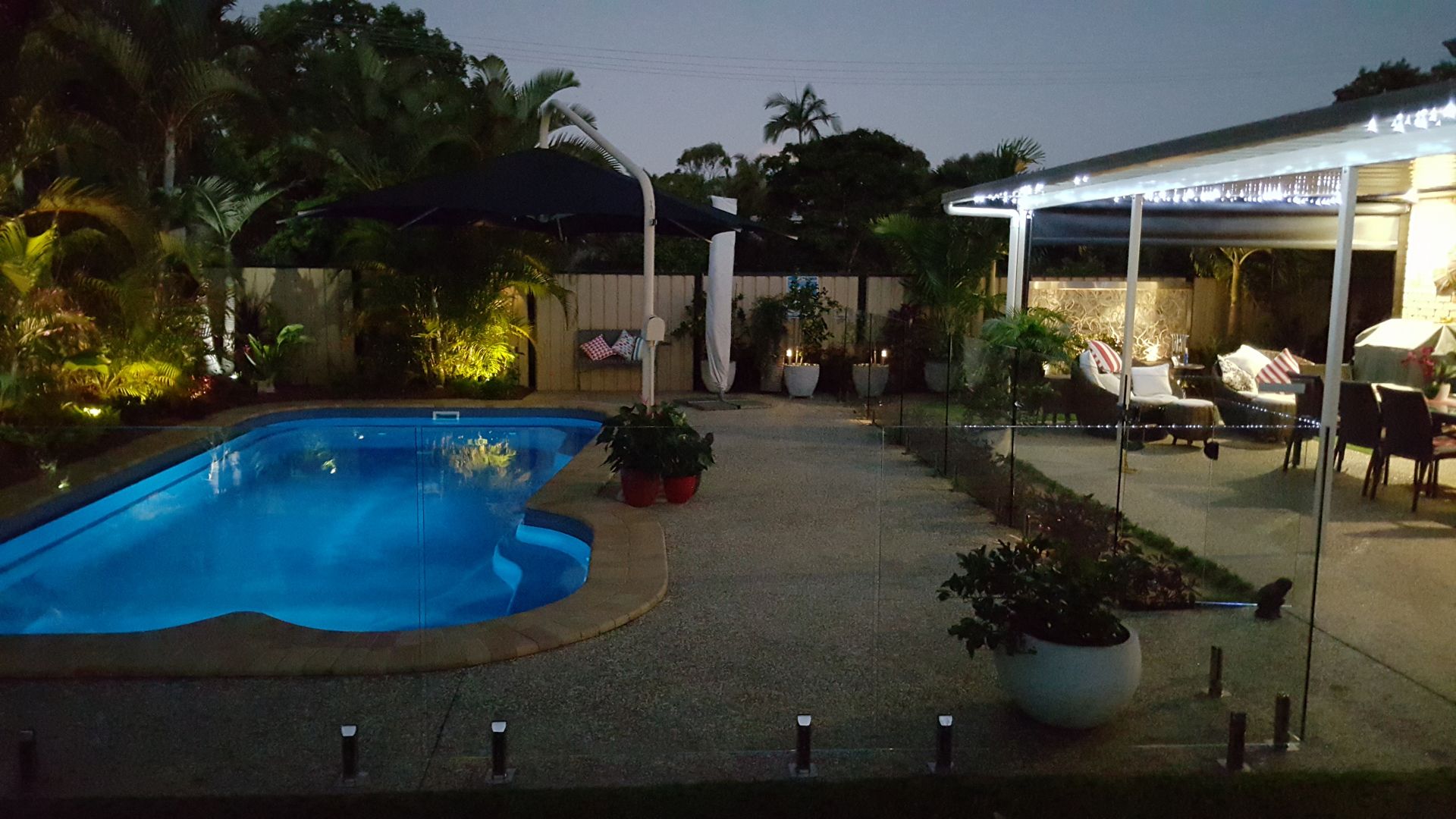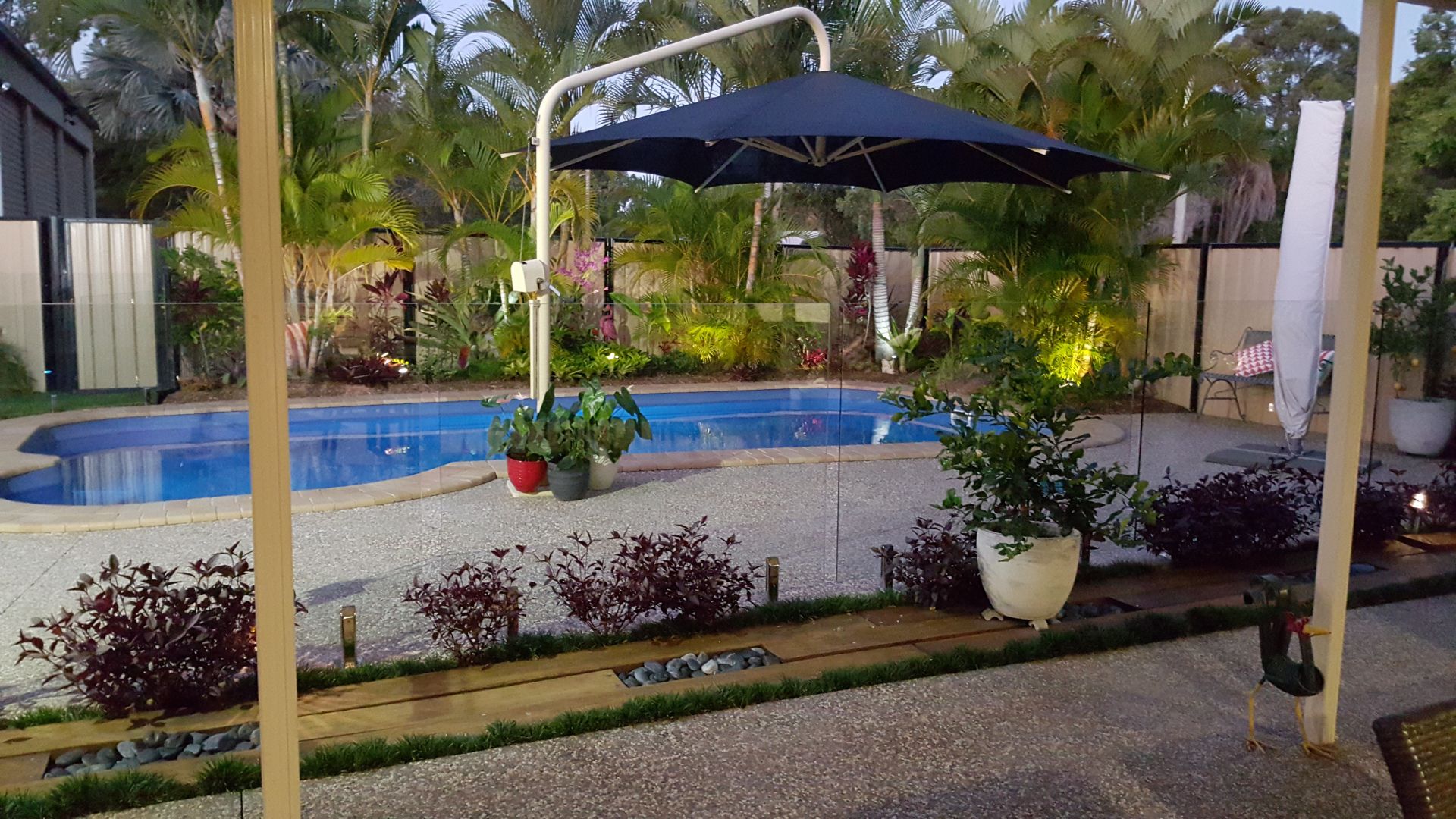 Sumptuous In Ground Salt Water Pool which is fully glass fenced and sits in a tropical garden complete with watering system and garden lighting.