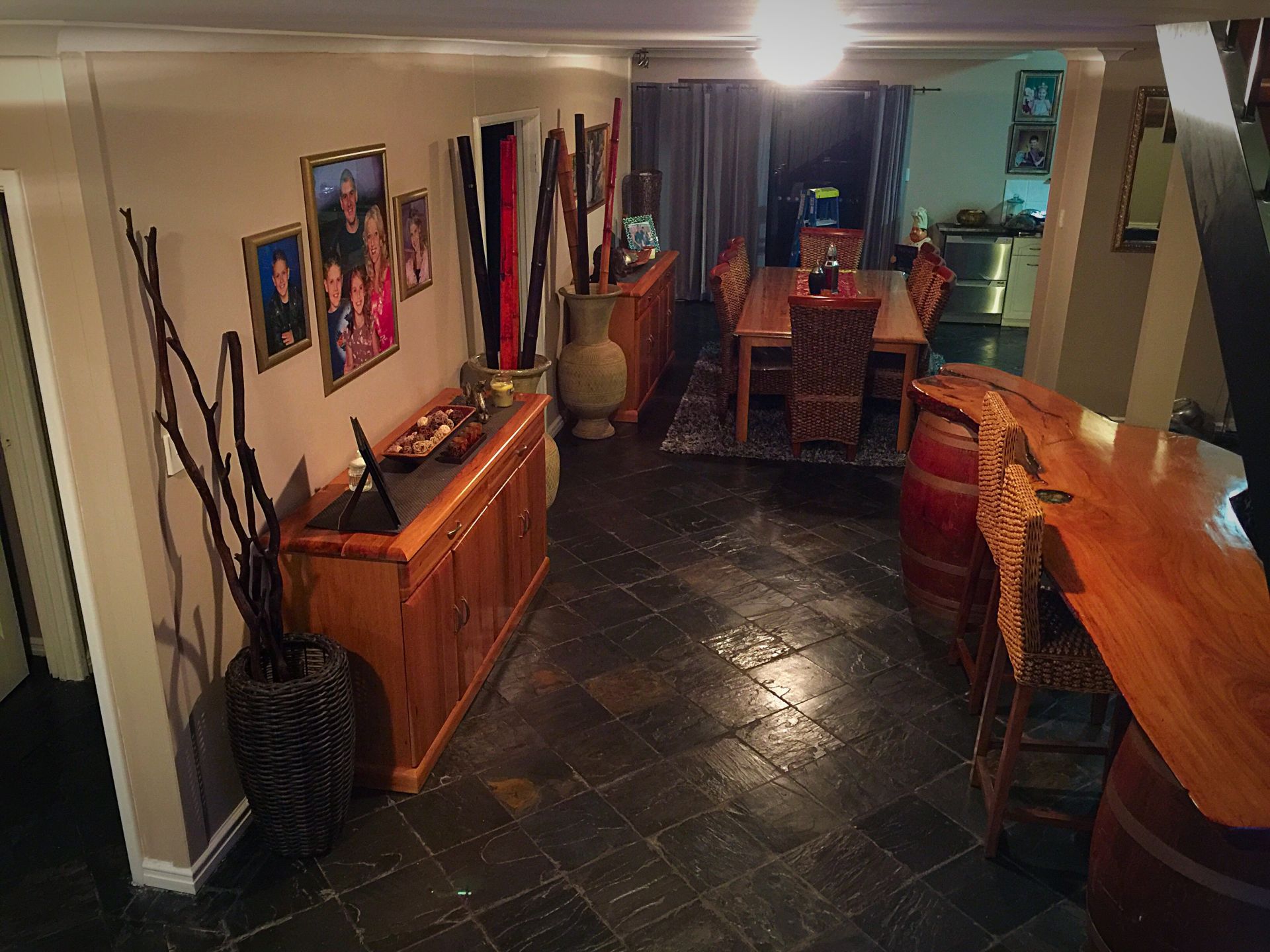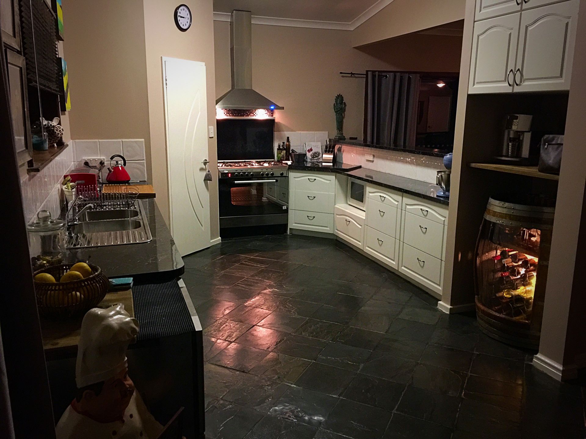 The house is open plan living down stairs with a nice kitchen that allows 2 or 3 people to utilise it at the same time. The kitchen oversees the slate tiled lounge and dining area and is kept at a nice temperature with either the reverse cycle AC, large log fire or just the Beverley breeze