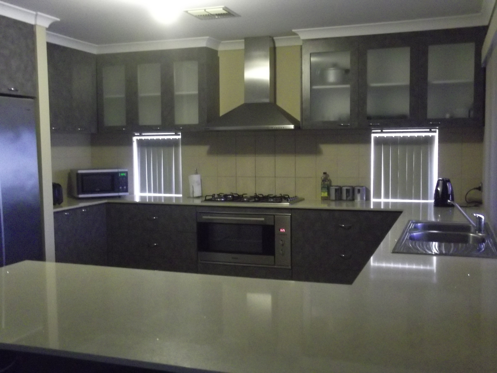*Extra large kitchen boasts Q-stone bench tops (also displayed in the two bathrooms) and extra wide 'Blanco' stainless steel appliances. (The oven is 900mm wide and the gas 5 burner hot plate is 850mm wide.)