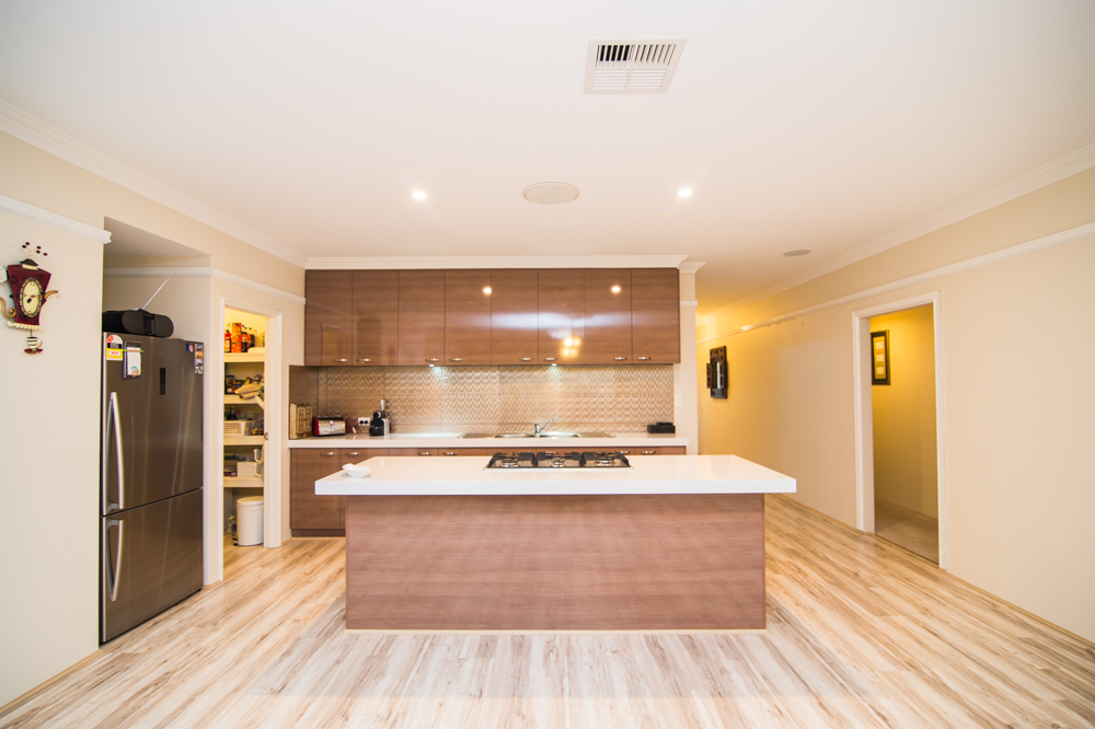 Large Laundry fully fitted with floor-to-ceiling cupboards and work bench with storage under. Access to Garden from Laundry.