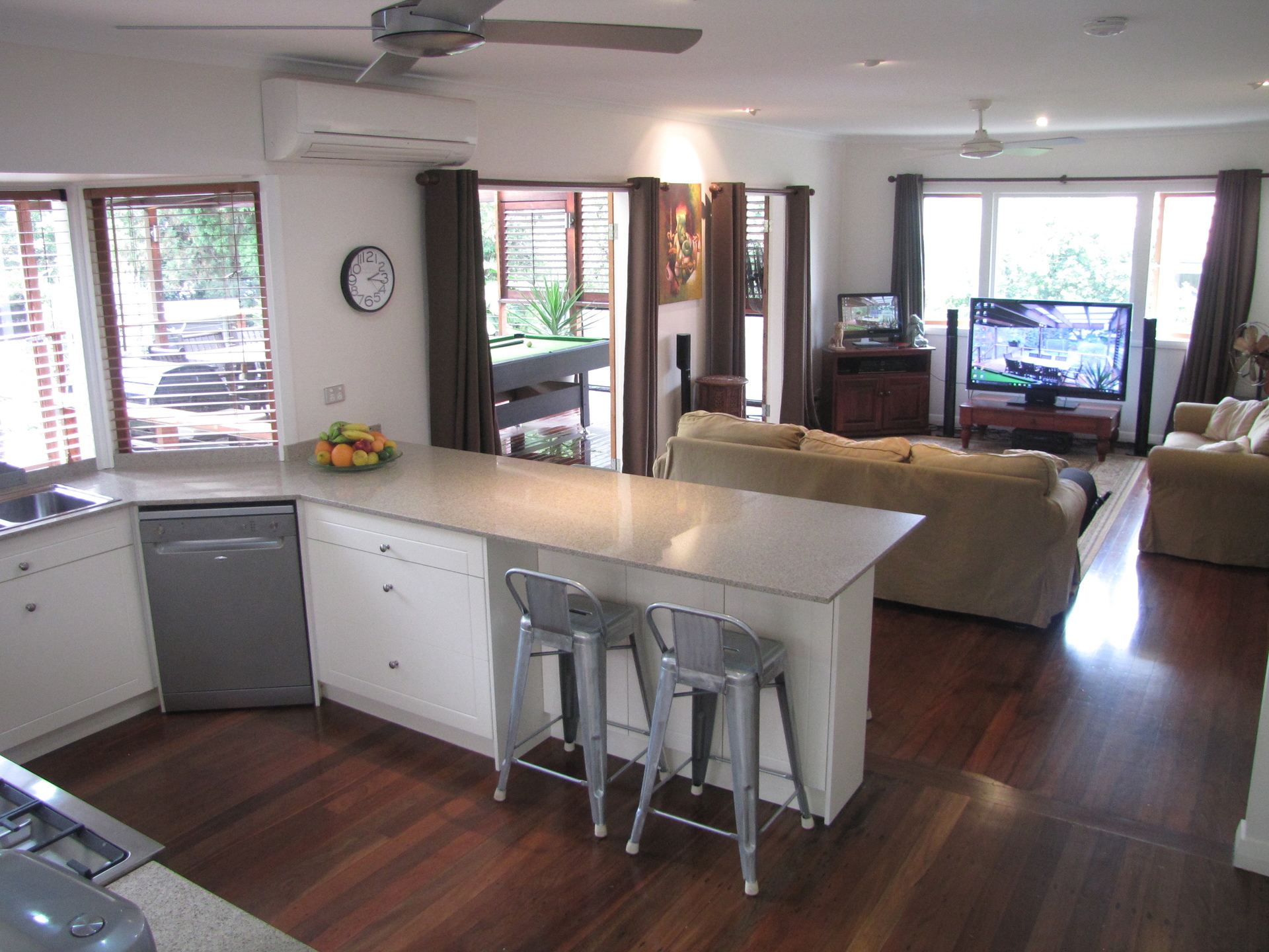 The breakfast bar is large enough to seat 6 comfortably.