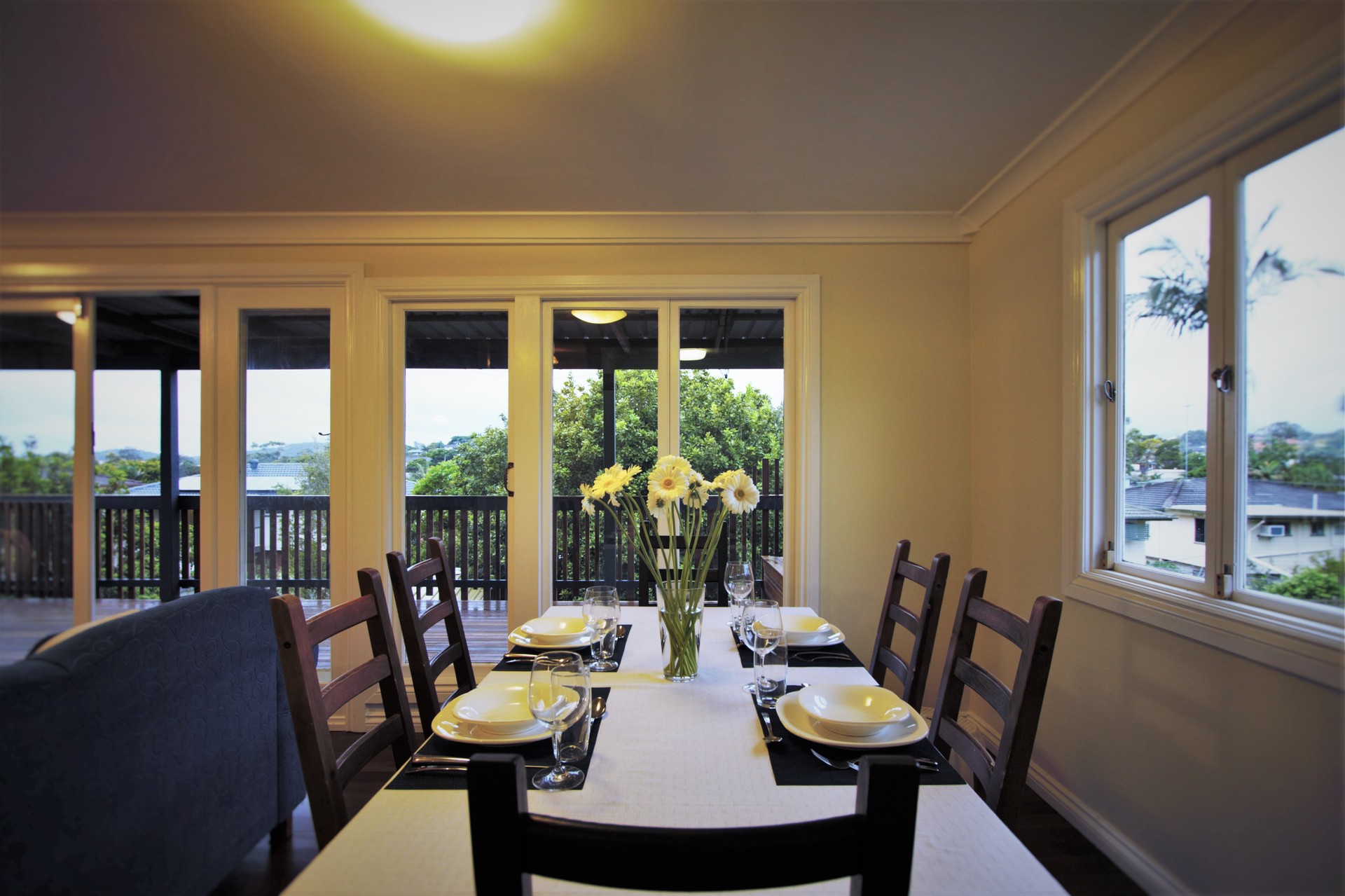 The kitchen is perfectly positioned to cater for entertaining in the jewel of the home: the vast rear living area. This living area is brightly lit thanks to magnificent wall-to-ceiling French doors and windows that open onto a large architecturally designed timber deck with a built-in bench seat. The high, elevated position allows uninterrupted views to the hills beyond while allowing cool easterly breezes to flow through the house. You can simply enjoy life as you either sit back and relax, or entertain guests in this magnificent setting.