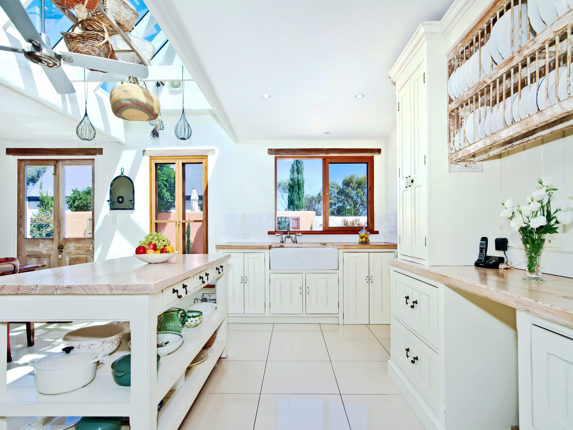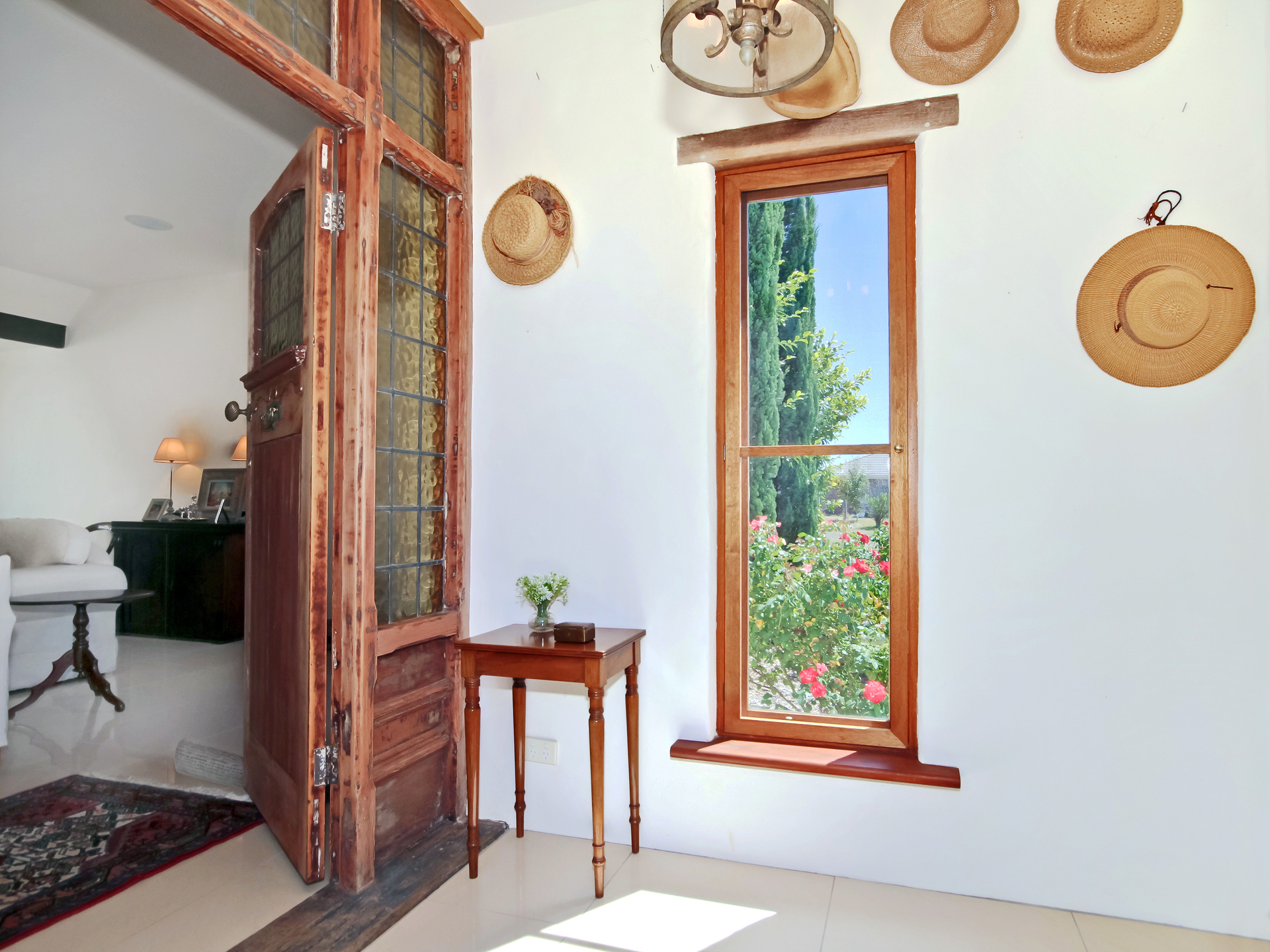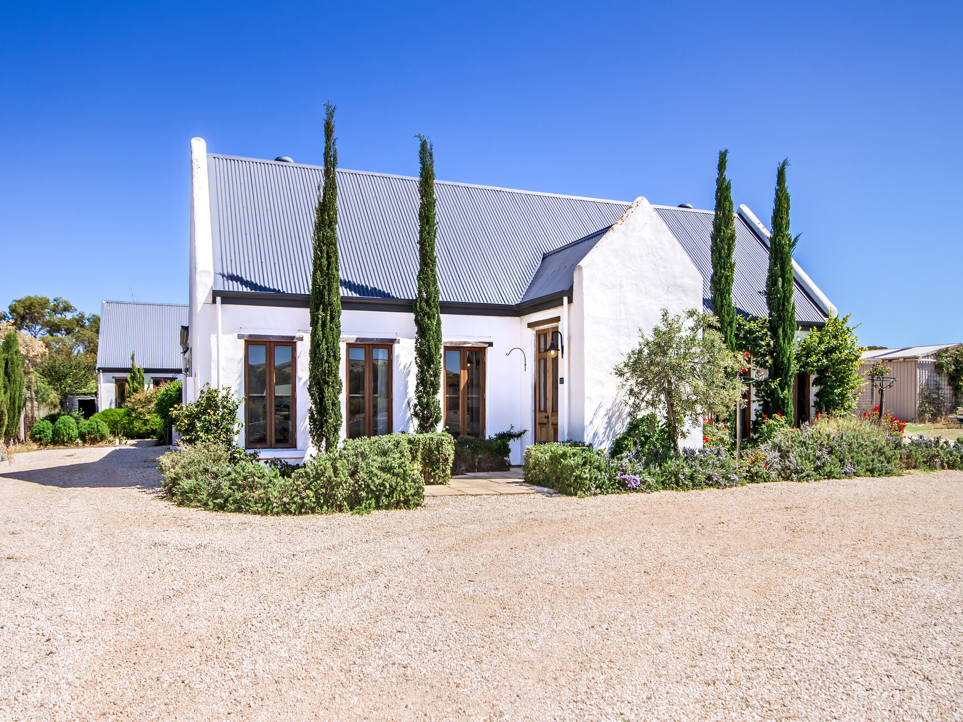 The impressive main house is approached by a long return driveway and entered via the charming vestibule. This leads to a generous living/dining area which is divided from the stunning kitchen/dining area by an impressive feature open fireplace. Flooded by natural light streaming through the steepled atrium roof, the French Provincial kitchen boasts a generous separate pantry room and handmade butlers sink with French doors leading into the large courtyard, which is separated from the cottage by a feature wall with wrought iron shuttered 'windows'.