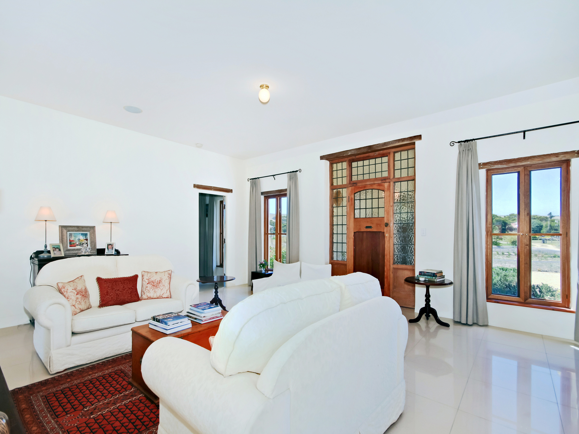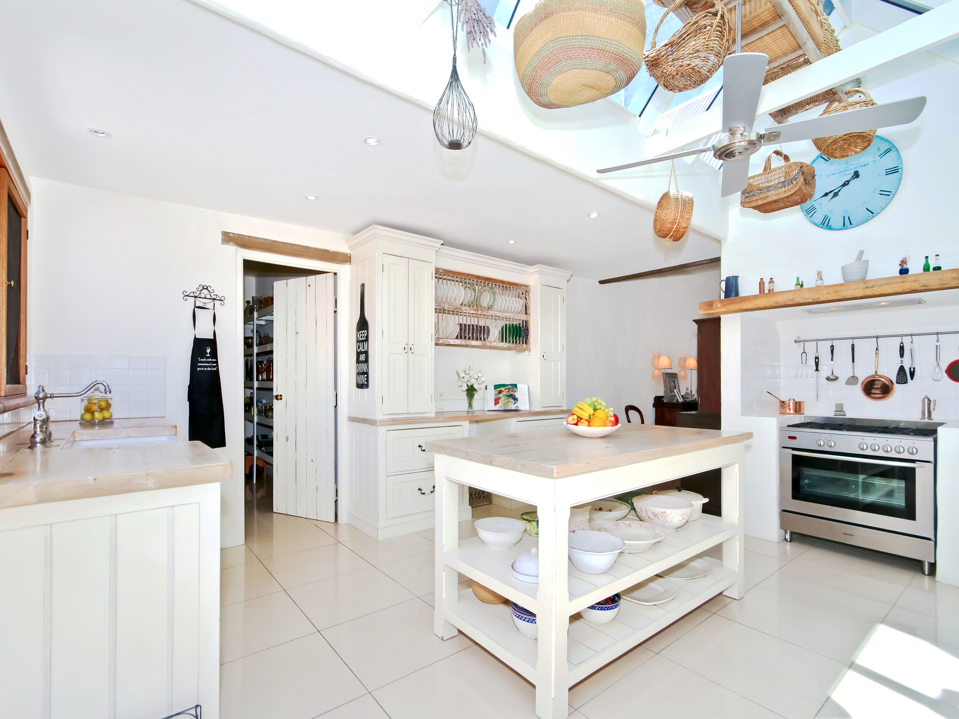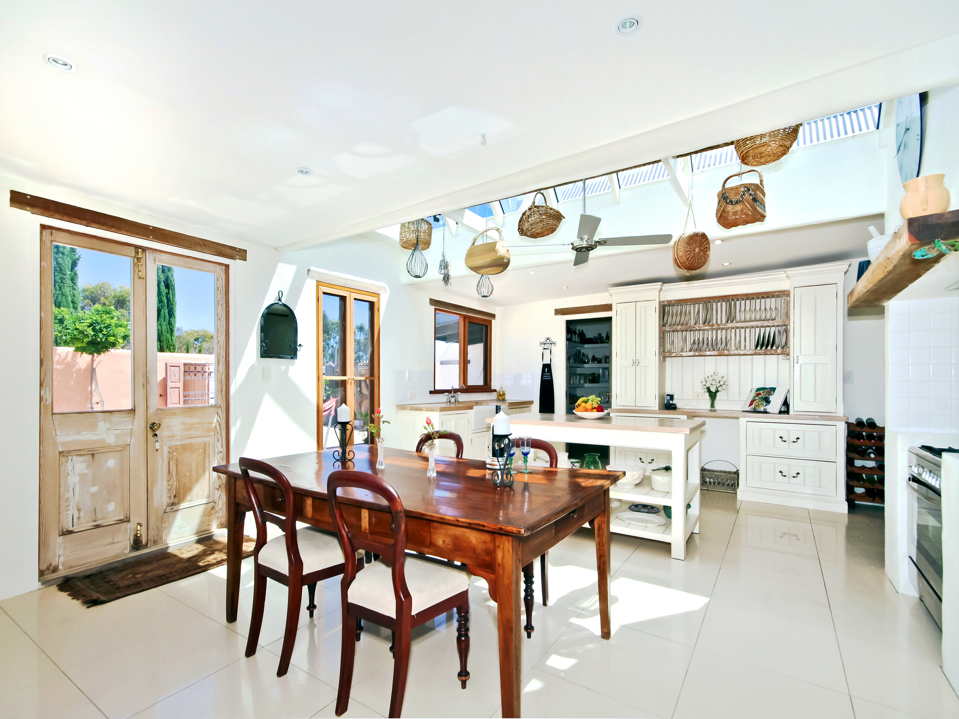The impressive main house is approached by a long return driveway and entered via the charming vestibule. This leads to a generous living/dining area which is divided from the stunning kitchen/dining area by an impressive feature open fireplace. Flooded by natural light streaming through the steepled atrium roof, the French Provincial kitchen boasts a generous separate pantry room and handmade butlers sink with French doors leading into the large courtyard, which is separated from the cottage by a feature wall with wrought iron shuttered 'windows'.