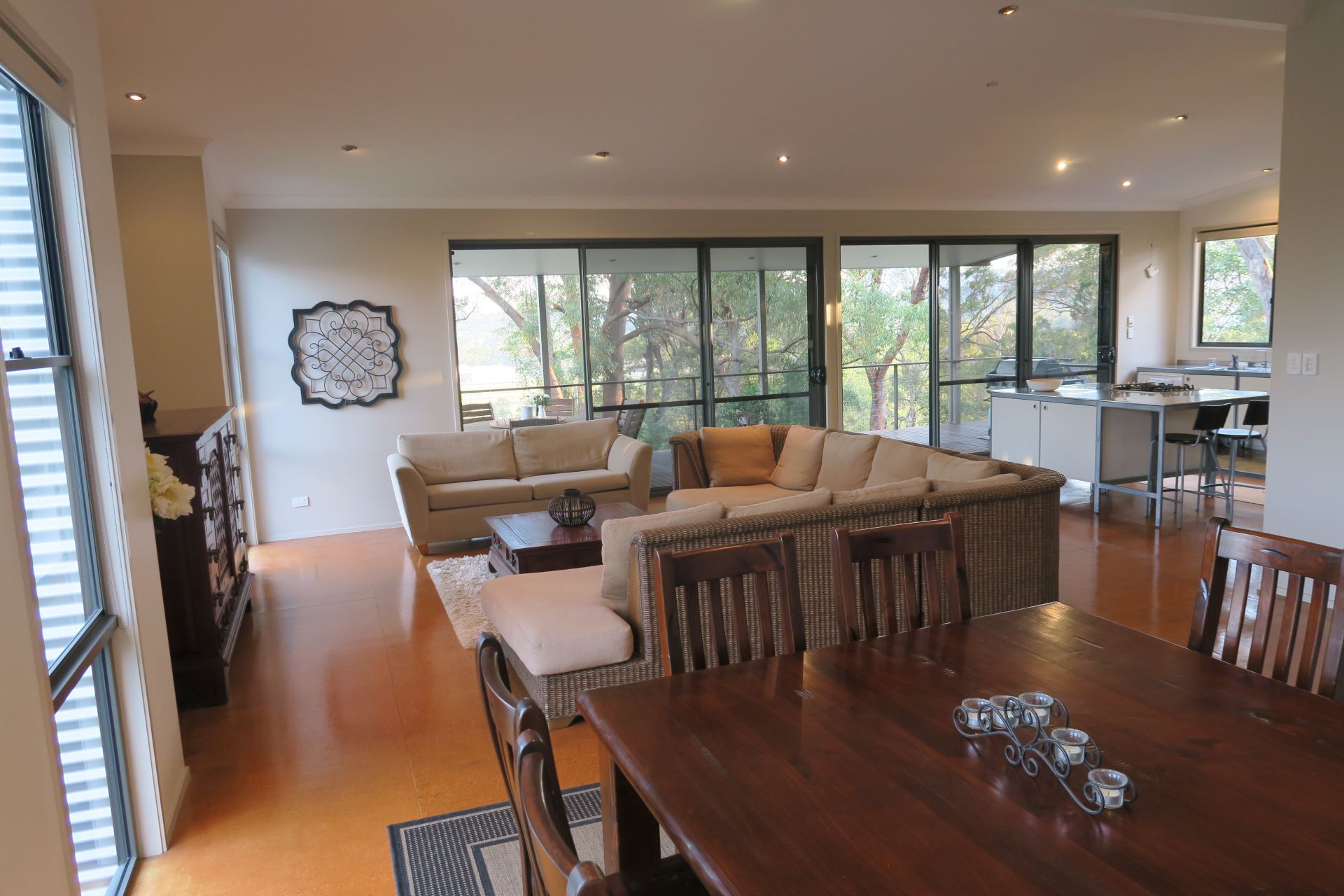 The contemporary home follows the fall of the land, with the open plan lounge, dining and kitchen spilling out to the views and a 10m x 4m deck for easy entertaining. The layout of the home also provides opportunity for family members to enjoy living spaces together or separated as the need arises. All rooms are spacious, yet warm and inviting, and the four bedrooms all have walk in robes. Try your hand at growing vegetables in the 6m x 4m green house or relax in the low maintenance gardens with the wallabies.