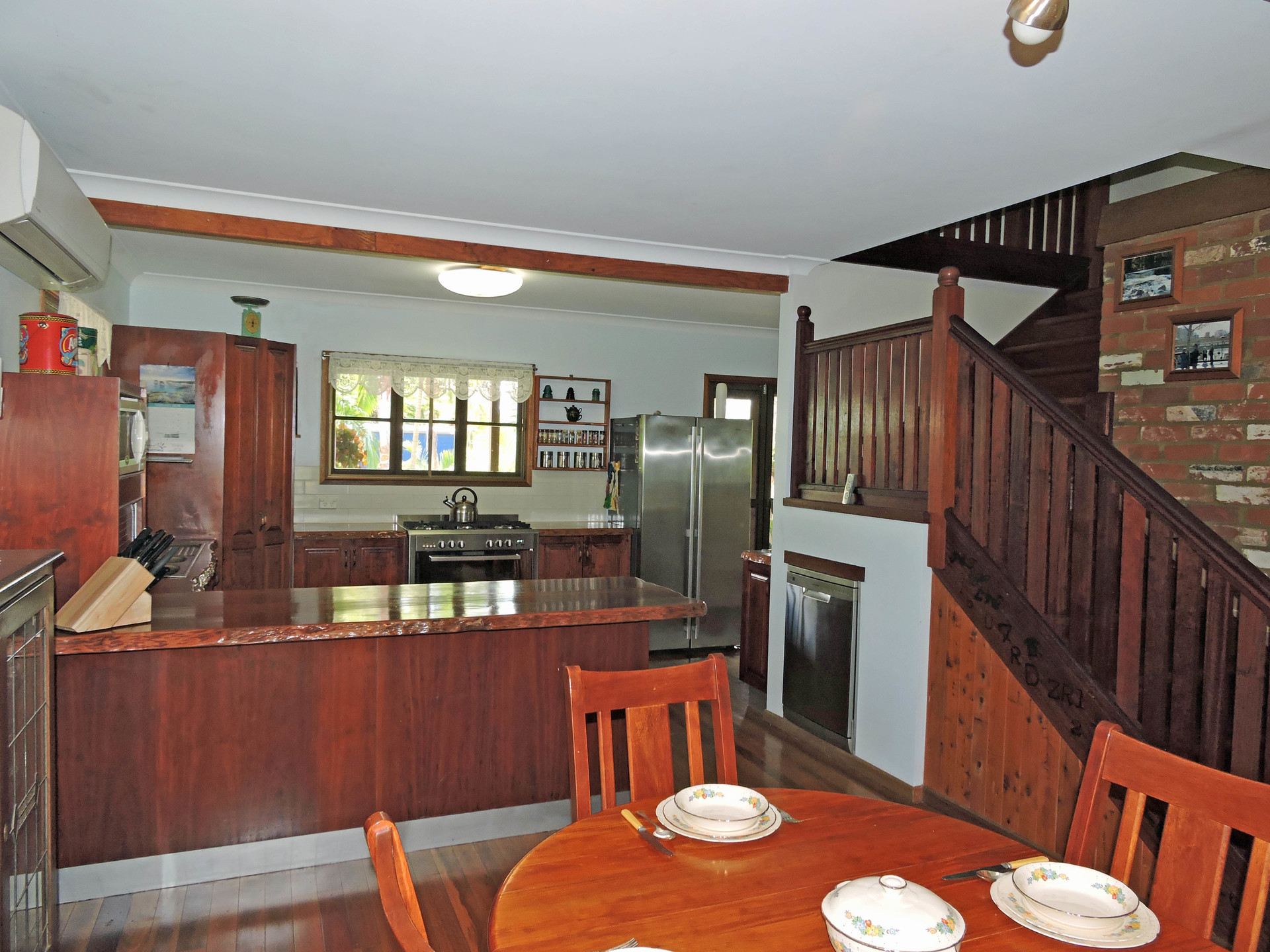 Spacious timber kitchen with new 900mm gas 5 burner free standing stove.