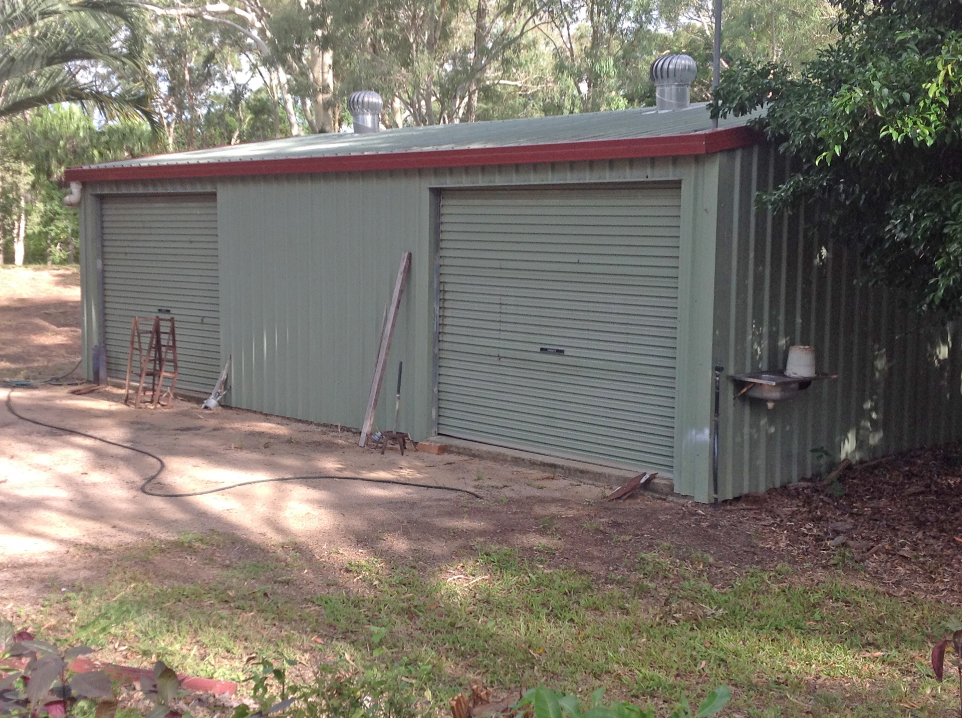 Rain water tank attached to shed.