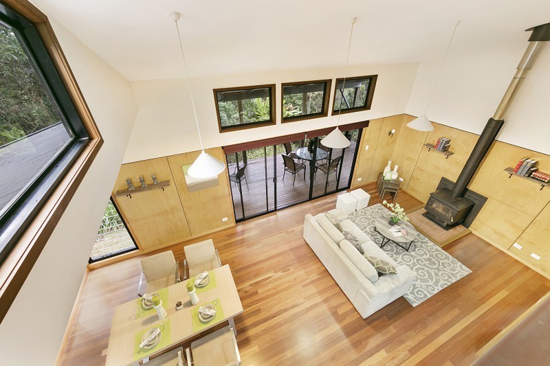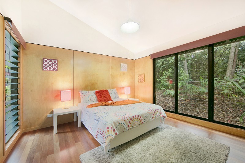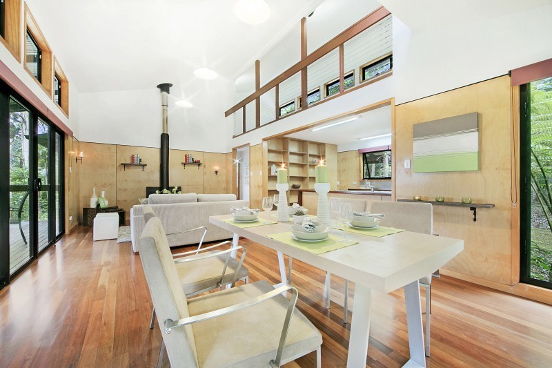 Principles of Sustainable Design - Environmentally approved plantation based timbers, and recycled timber kitchen bench, Large quantities of natural light, Roof slope and NE aspect designed specifically for Solar, Self-maintaining rainforest garden and large water tanks capacity to support self-sustaining food production.