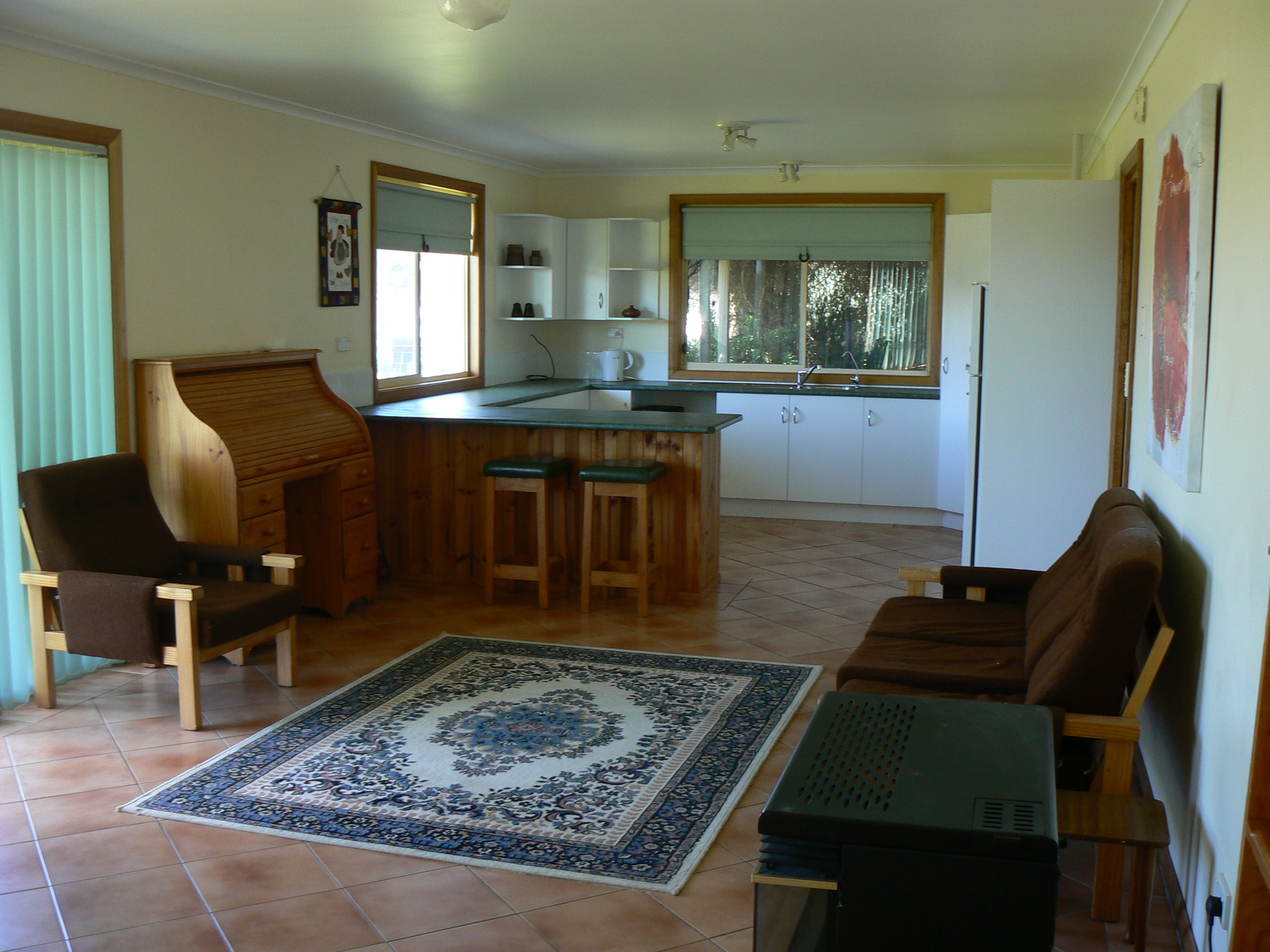 The front of the house is open-plan with a gas log heater and modern kitchen. There are 3 bedrooms, inside laundry, bathroom and separate toilet with blinds to all windows. The open plan area and utility areas are beautifully tiled, while the bedrooms are carpeted. A covered patio fronts the entire length of the house, and there is a pergola style barbecue area adjacent to the kitchen.