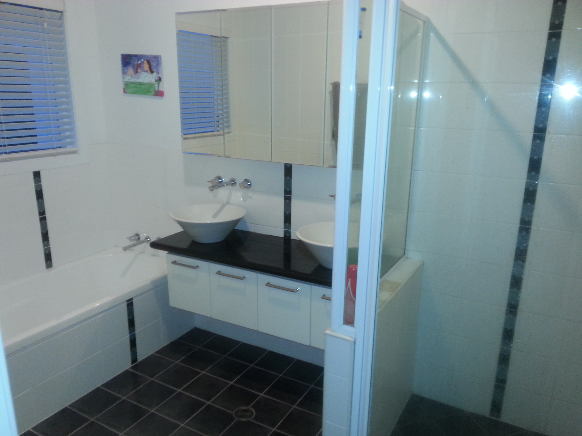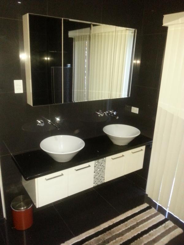* Main bathroom features separate shower; bath; double bowl vanity with granite bench top. Separate toilet