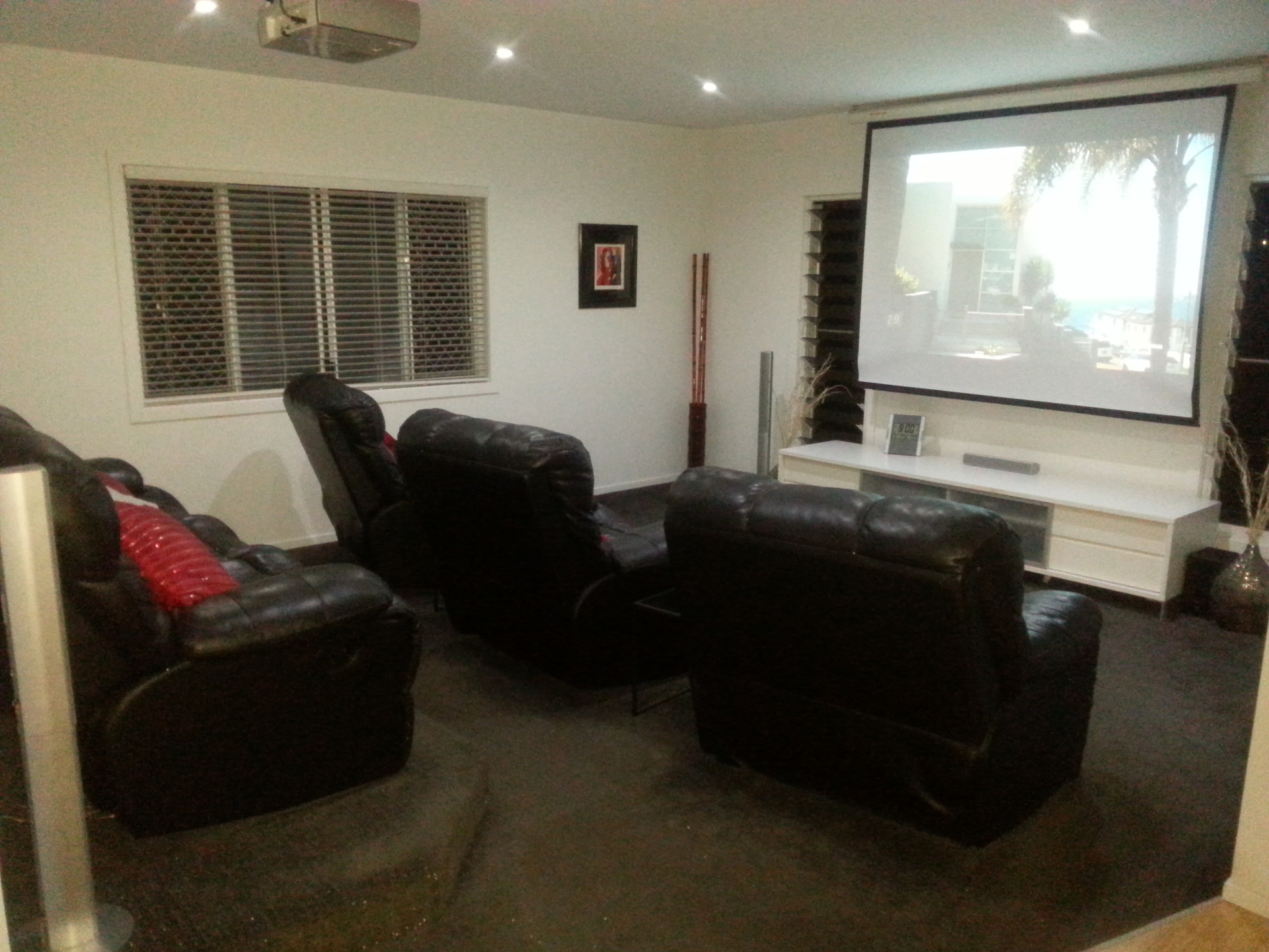 * Lounge room features teared seating, built in top of the range Epson LCD Projector and large motorized screen