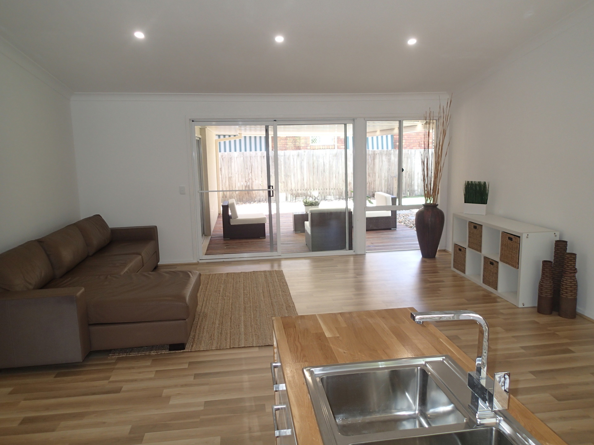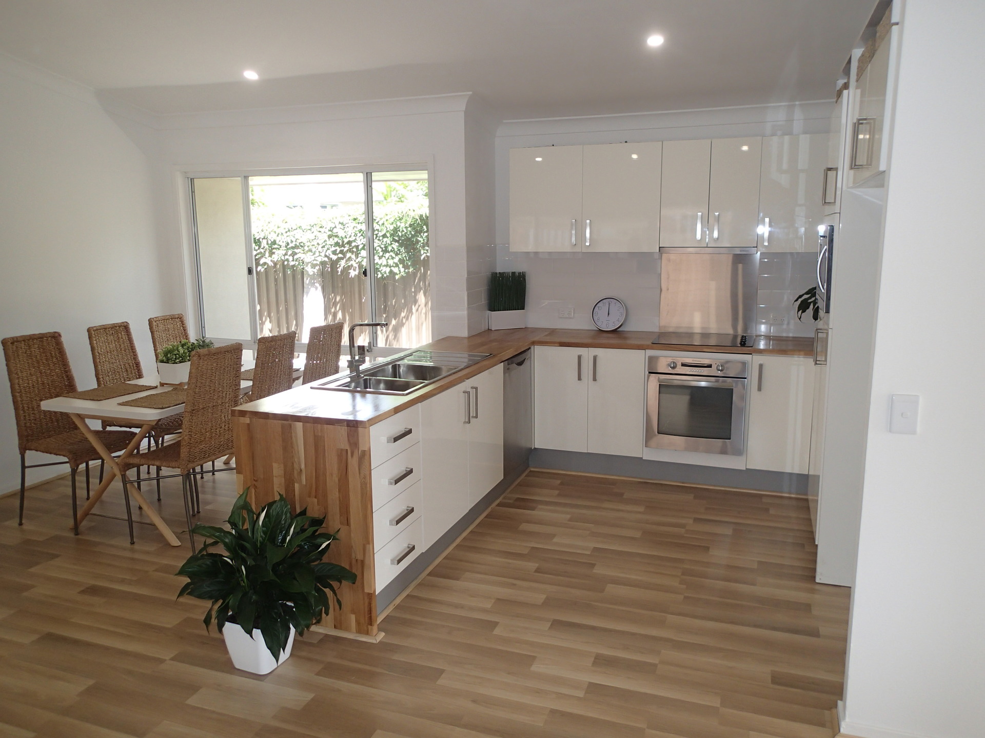 Large Kitchen and Family room with beautiful high raked ceilings. Kitchen has full stainless steel Westinghouse appliances and beautiful timber bench tops.