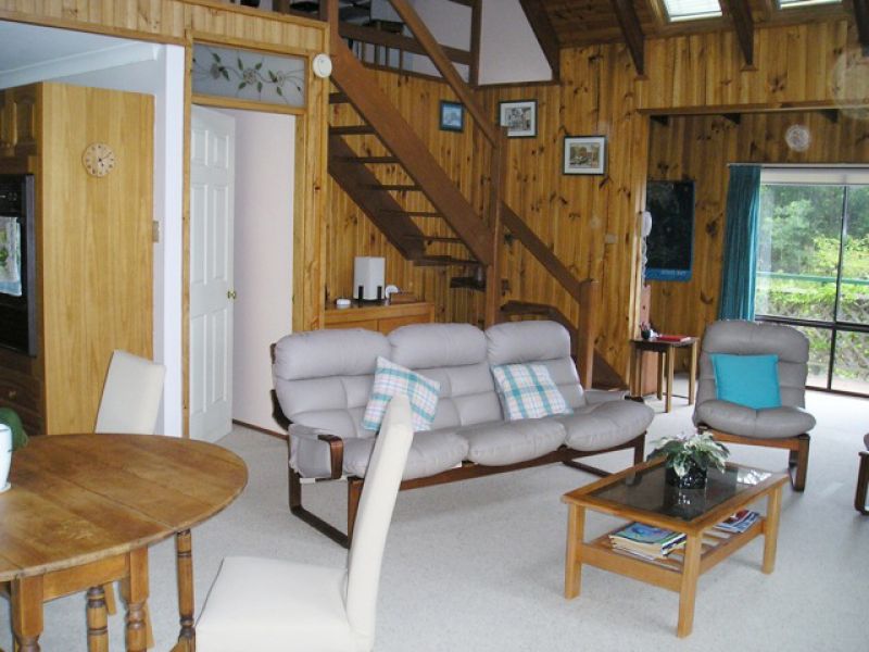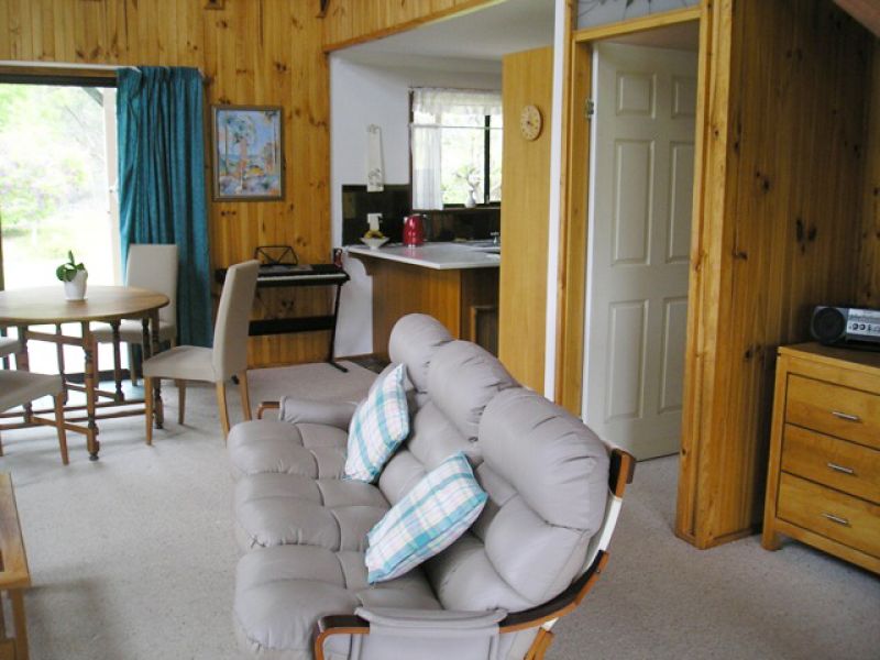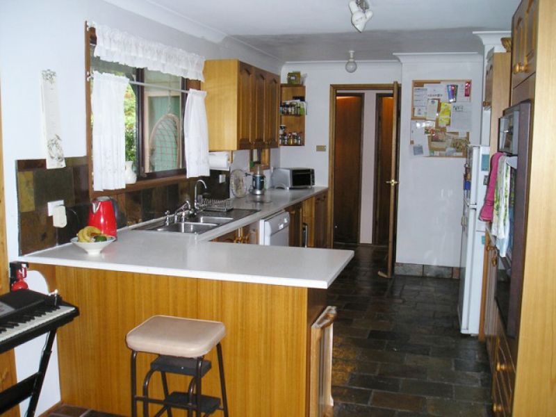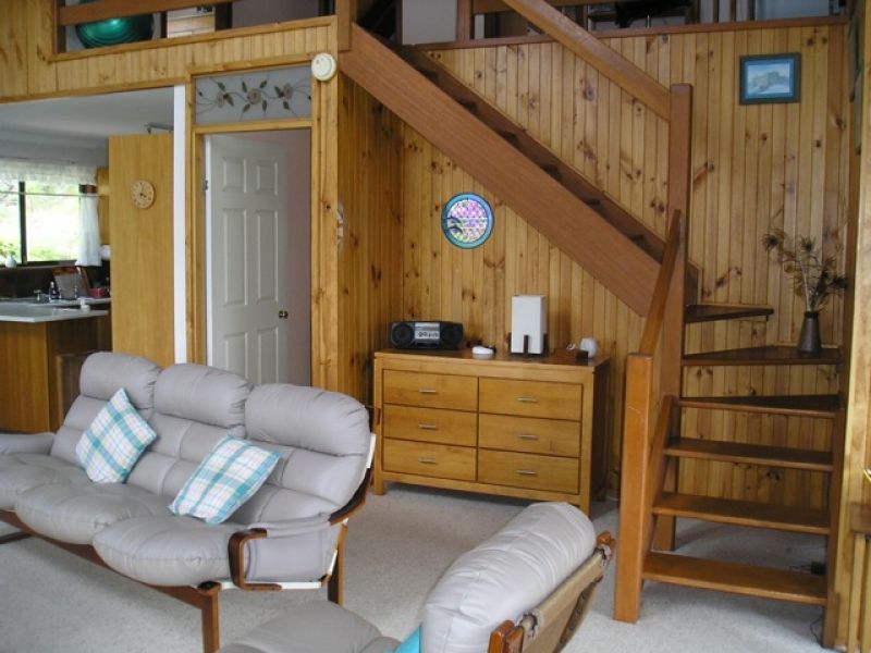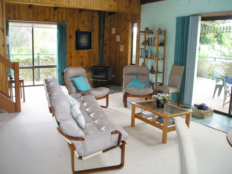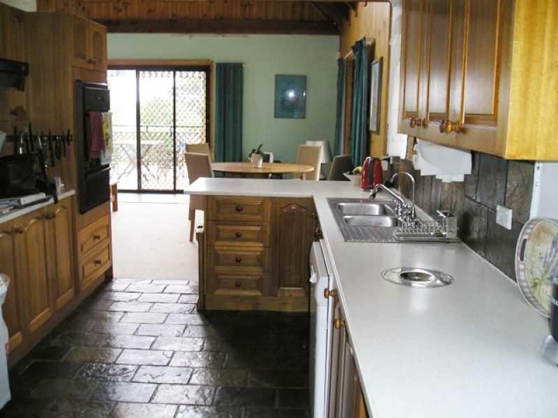 North facing, the house is bathed with light. Cathedral ceilings and skylight windows add to the charm of the open plan lounge and kitchen. A wood burning stove ensures cosy winter evenings. Plenty of storage with fitted wardrobes in all four bedrooms plus hall cupboard and large laundry. Rainwater tank feeds the downstairs toilet and washing machine. Solar panels proved abundant electricity.