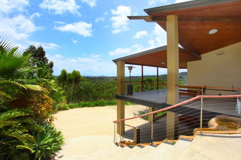 This 2 story delight features 4 bedrooms upstairs with massive open plan en-suite off master bedroom with sweeping views of the Gold Coast. While under the suspended slab design you have your own fully self contained 1 bedroom flat with separate bathroom and laundry, and lounge/kitchen dinning area. This flat adjoins a fully equipped separate entry office which also features the magnificent views, the office is on the same level as the 4 car garage, perfect for a working family...