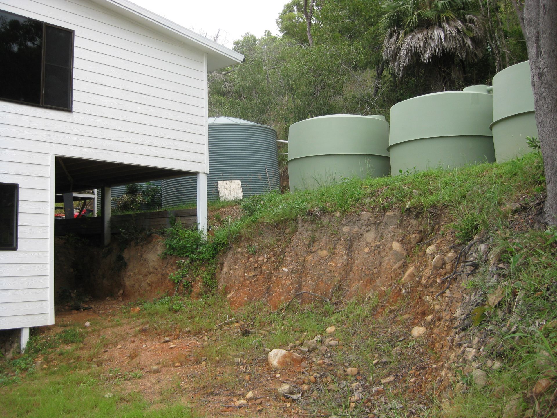 The backyard contains the water tanks. A pressure pump is used to pump up the head tank (3000 litres) from the storage tanks: three 27,250 litre plastic tanks and three 10,000 litre fibreglass tanks. This gives a total storage capacity of 115,000 litres of rainwater. A solar hot water system supplies to the kitchen, bathroom and laundry tubs.