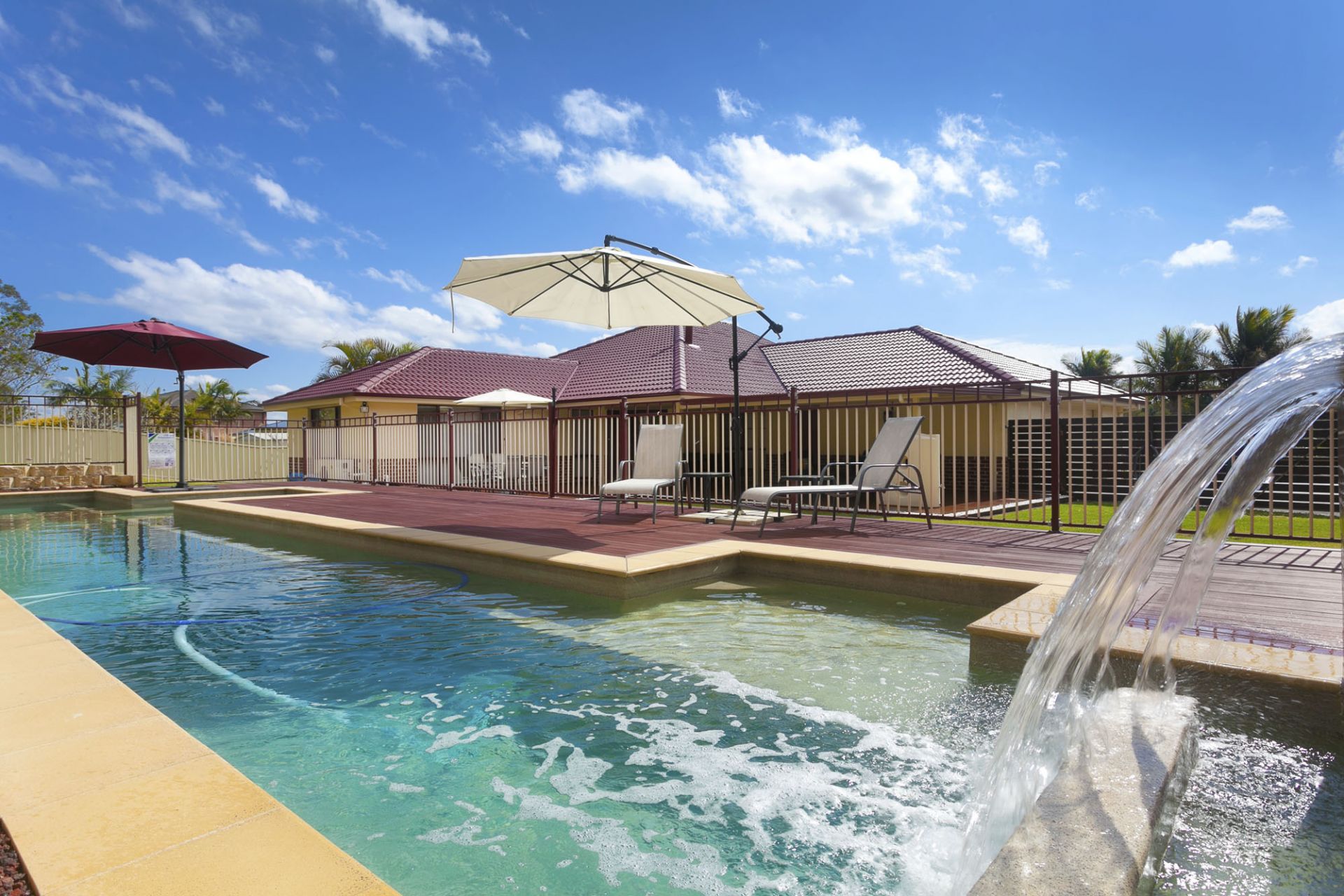 Stunning, resort style heated salt water lap pool with water feature and spa for year round swimming