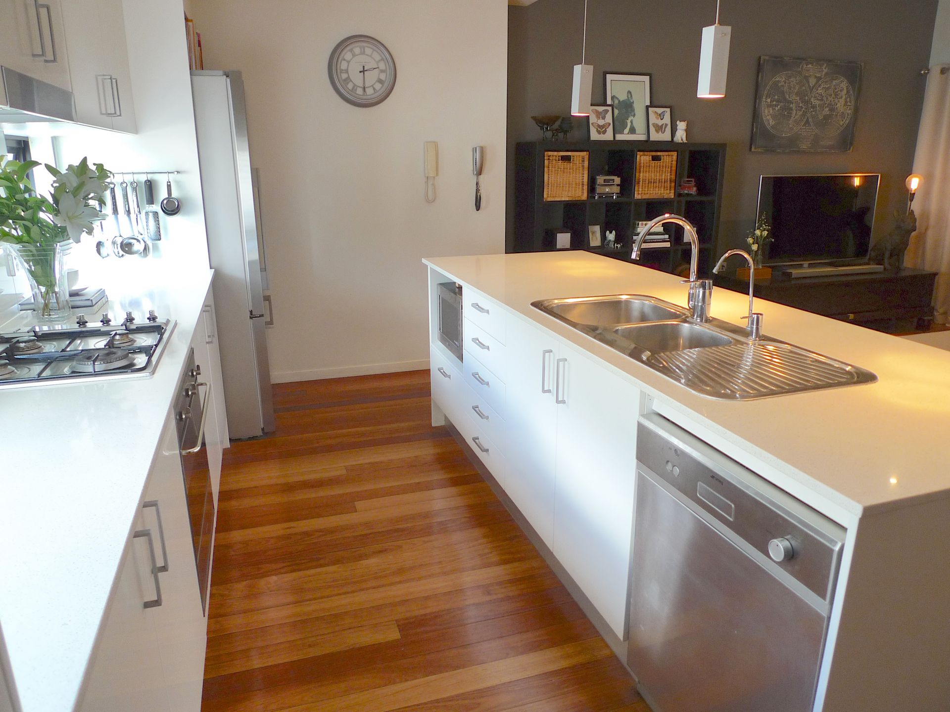 * Modern kitchen with Caesarstone benchtops, gas cooktop, stainless steel SMEG appliances