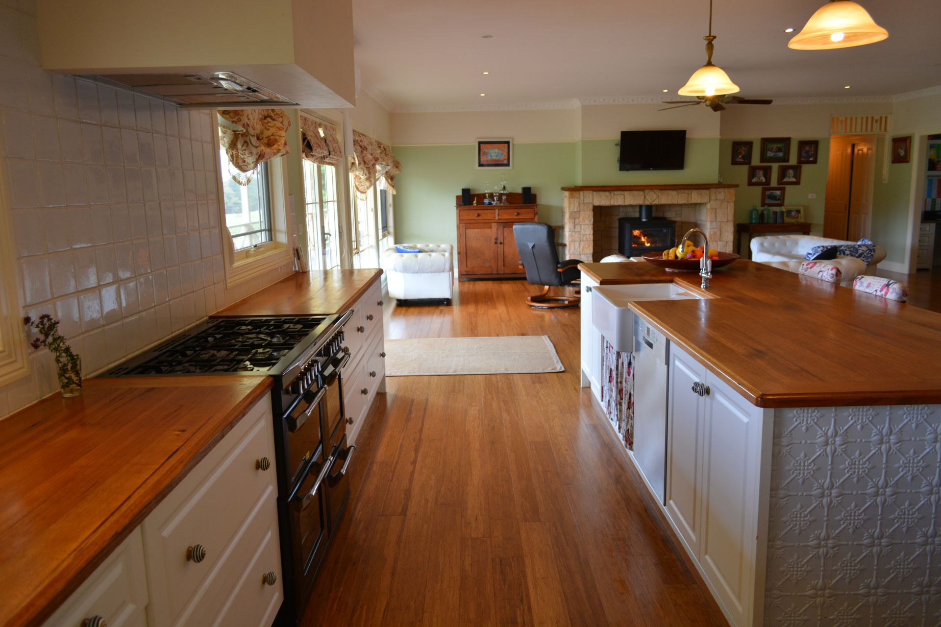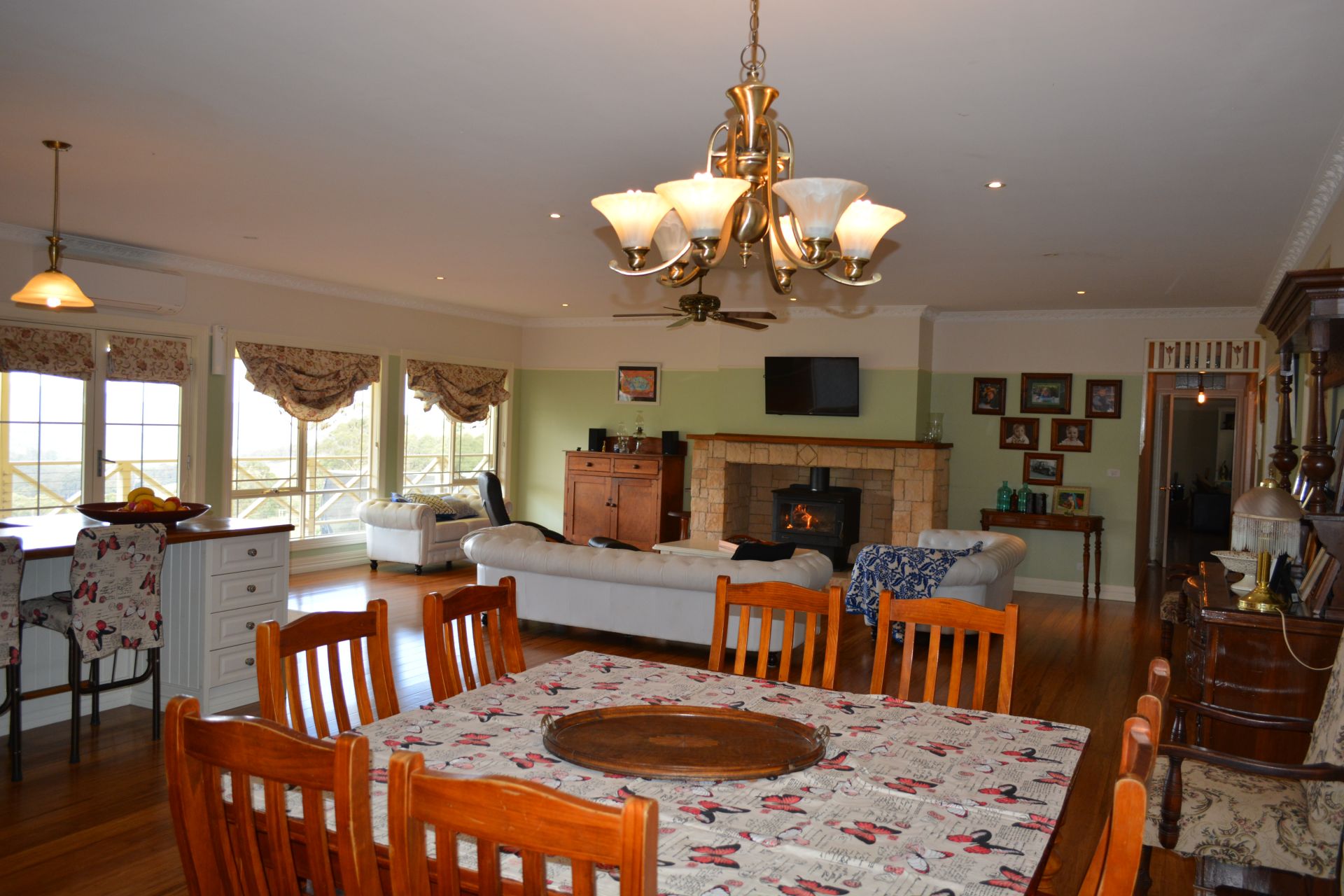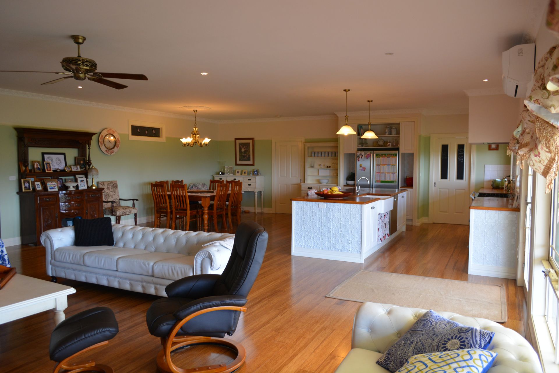 Massive lounge / dinning / kitchen with fire place and split system