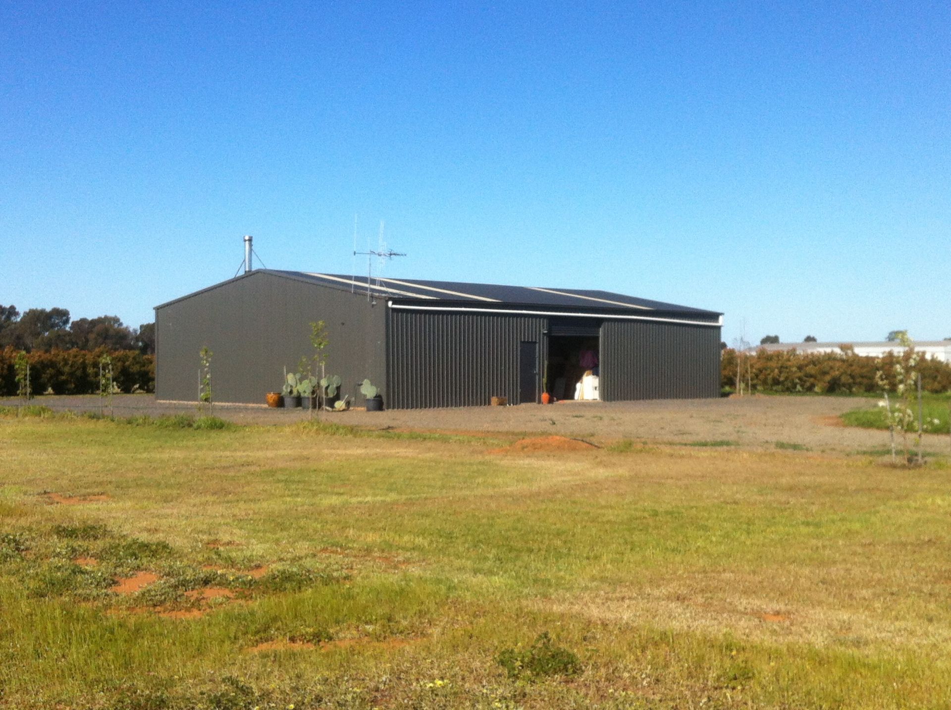 Large nearly new approx. 4 years old Colorbond shed, size 12 m wide x 18 m long. 2 x drive through roller doors. Roller door's clearance is 2.9 m high or 9' 6 1/2". Roof skylights. 216 sq. m concrete steel troweled floor area. Would suit tradies, horse pony enthusiasts, boat, caravans, boats...room for all the boy's toys.