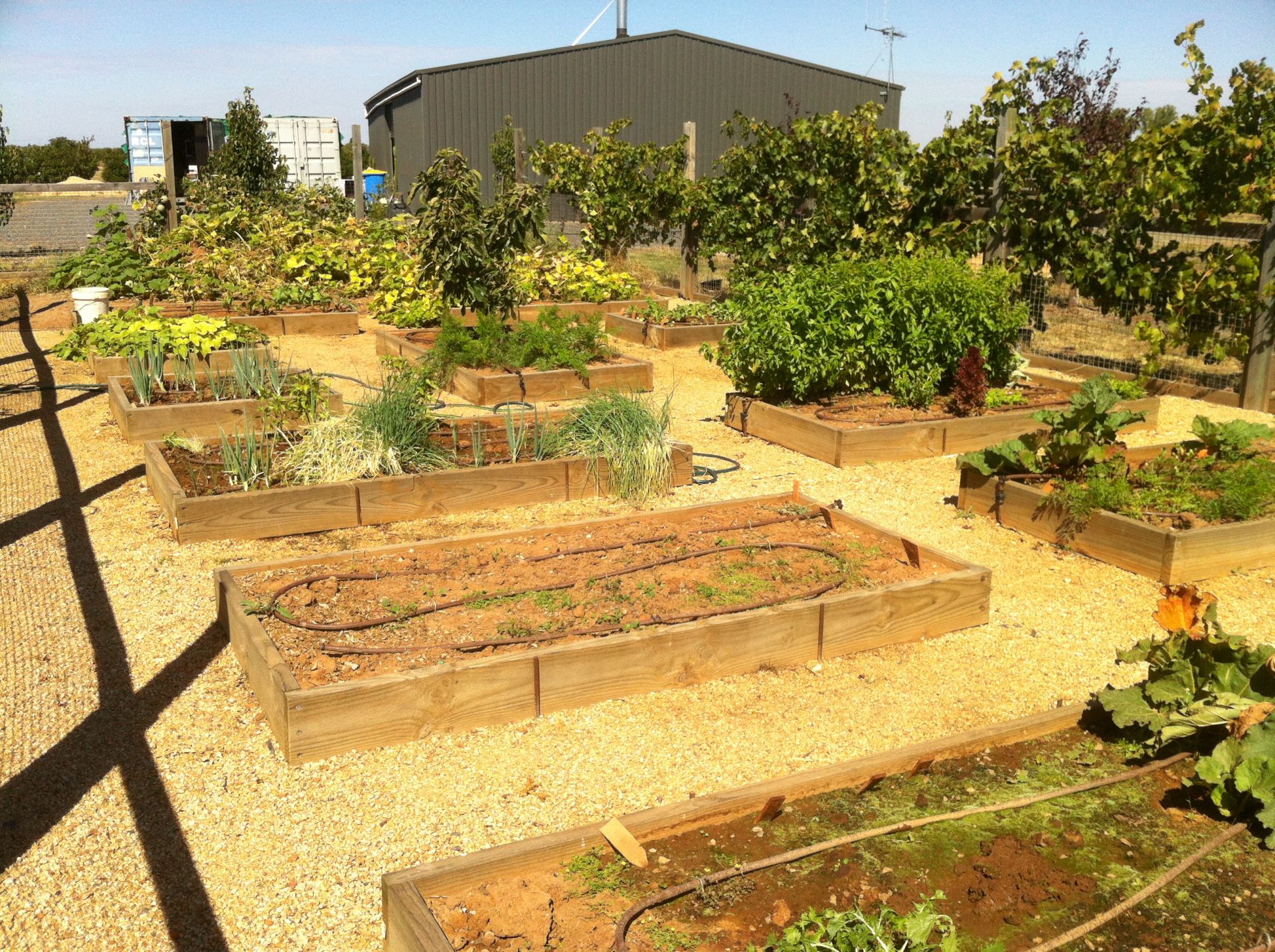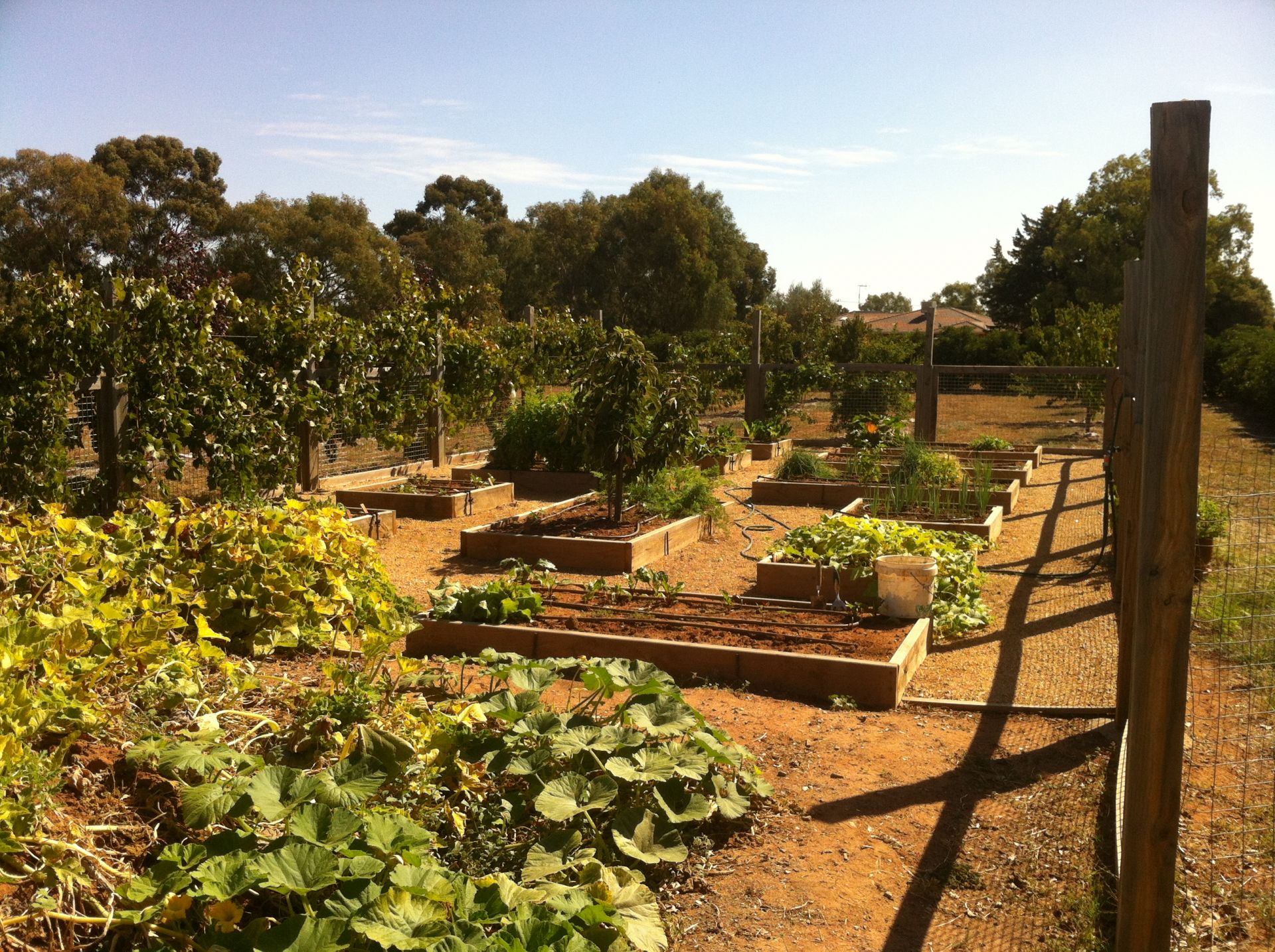 8 m approx x 17 m approx rabbit proofed fenced veggie garden with gravel pathways. Raised beds.