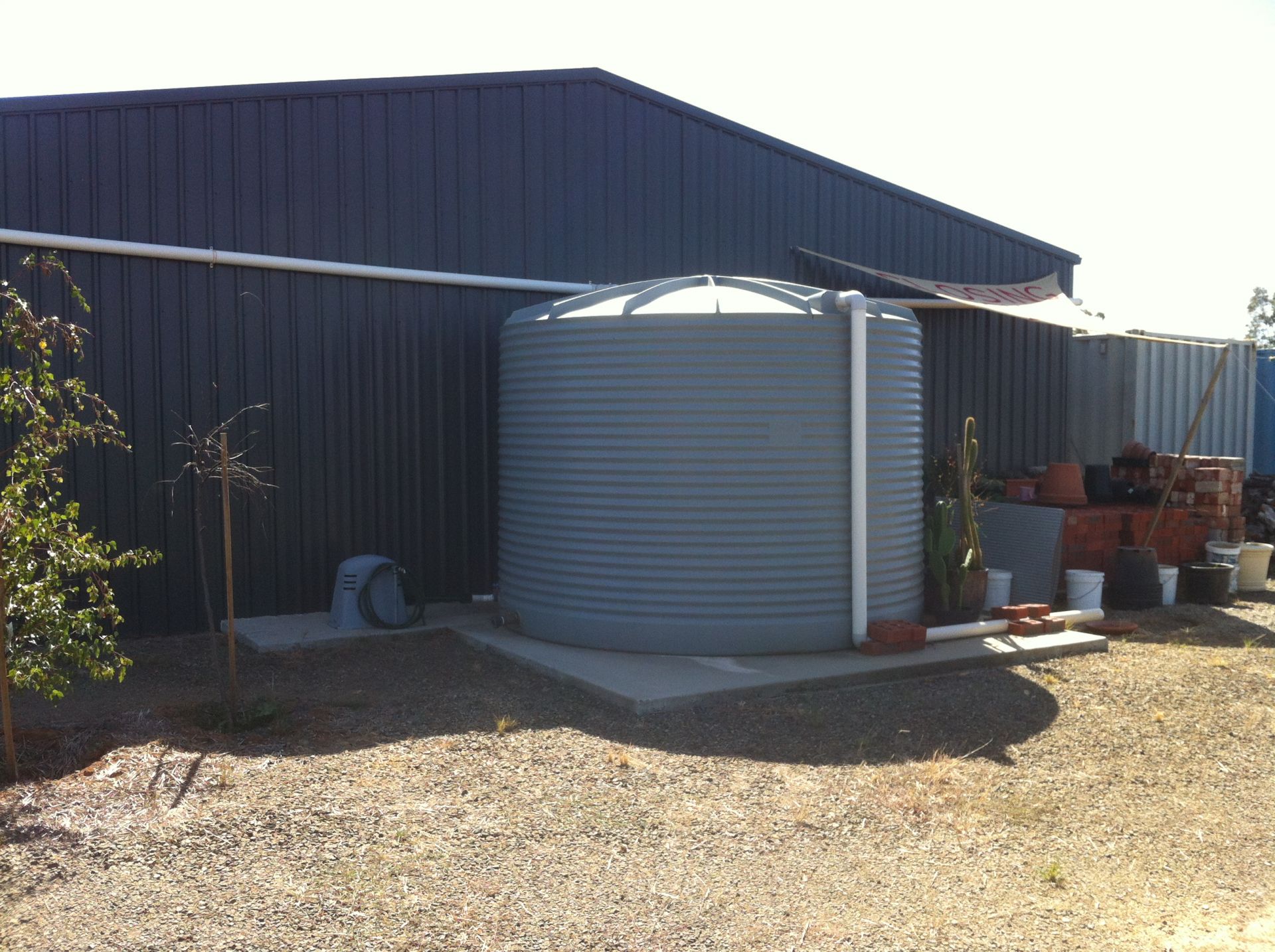 15,000 litre rainwater tank with electric auto pressure pump. Tank has 50 mm Fire Hose connection. Tank on concrete hardstand platform,