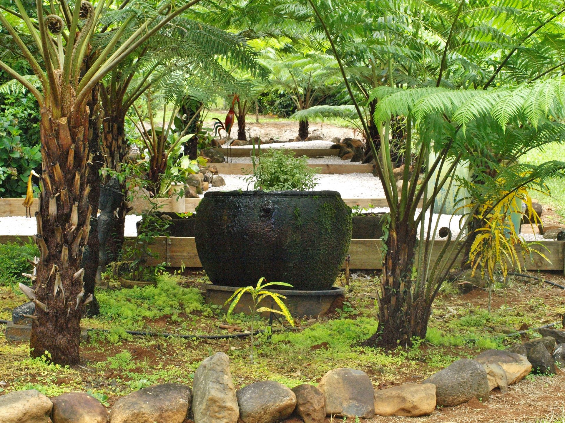 > Landscaped gardens including fruit and nut trees surround the house.
