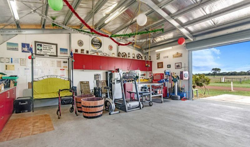 The brand new 9x11 metre garage features concrete floor, two bays 9x7.4m of workshop and vehicle parking, power, fully insulated, plumbed sink, overhead cupboards, benches and underneath cupboards.