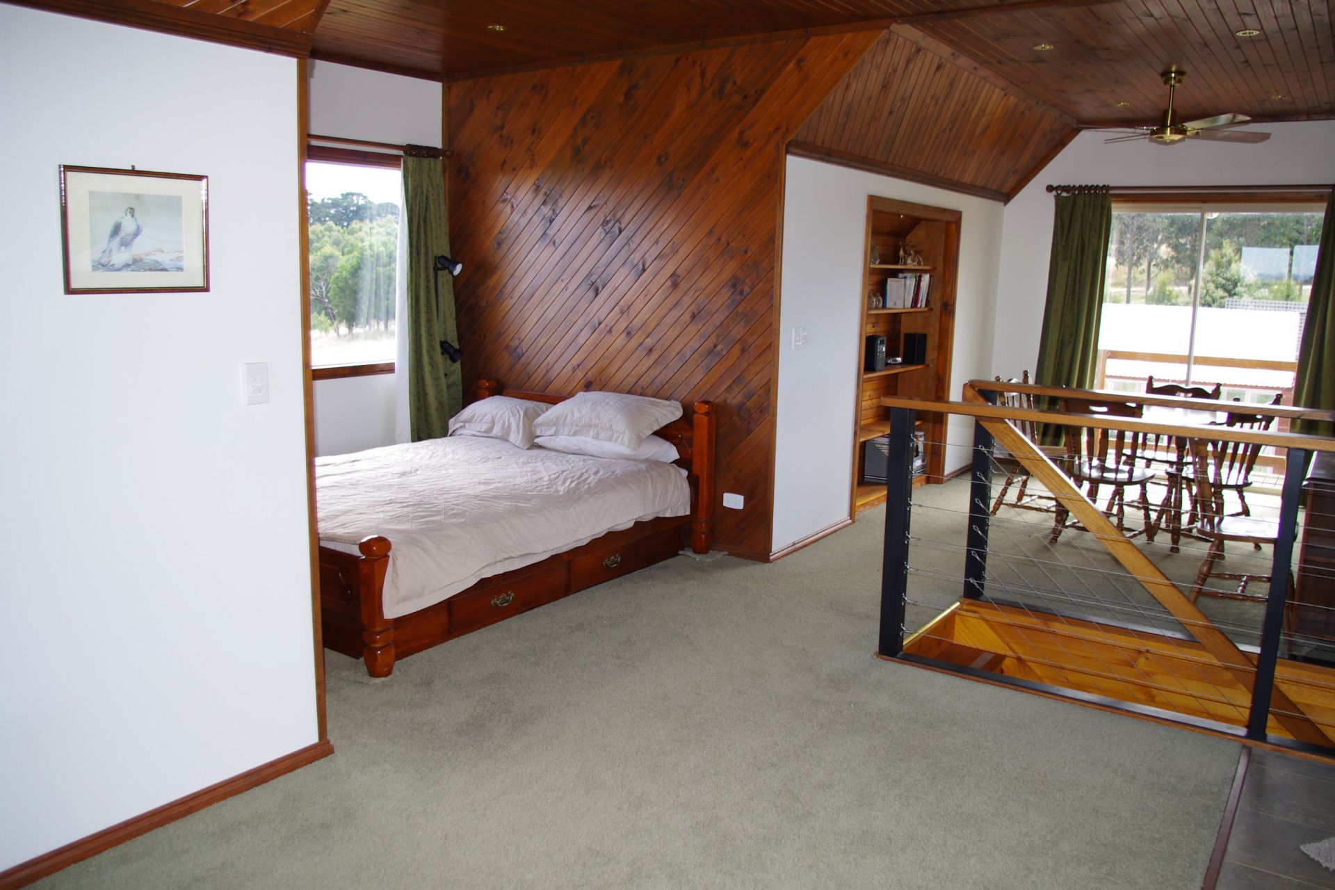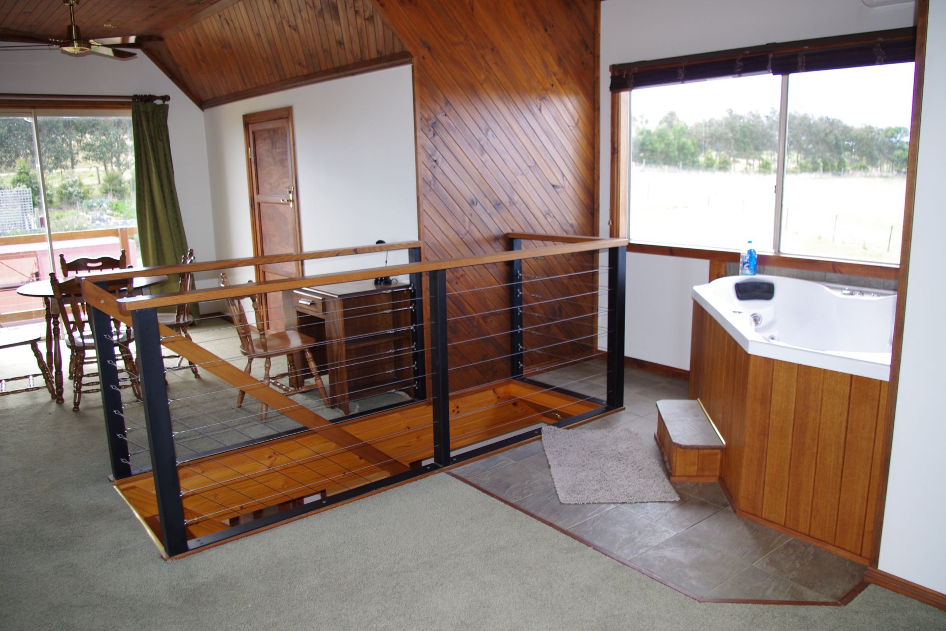 The roomy cottage includes a large open plan living and dining area with a generous kitchen fitted with two large stoves (one gas/electric the second a quality slow combustion wood stove with hot water) that opens onto a lovely north facing deck. The current layout of the residence is two bedrooms with the top floor being the master bedroom/parents retreat featuring a corner spa with forest views. The upper level could easily be converted to provide a third bedroom if required. There is reverse cycle air-conditioning on both levels, a large wood heater, two first floor balconies, sundecks on the north and west and covered BBQ/entertainment area between the house and double garage. There is also a greenhouse/shade house and plenty of space in the vegie garden for someone with a green thumb.