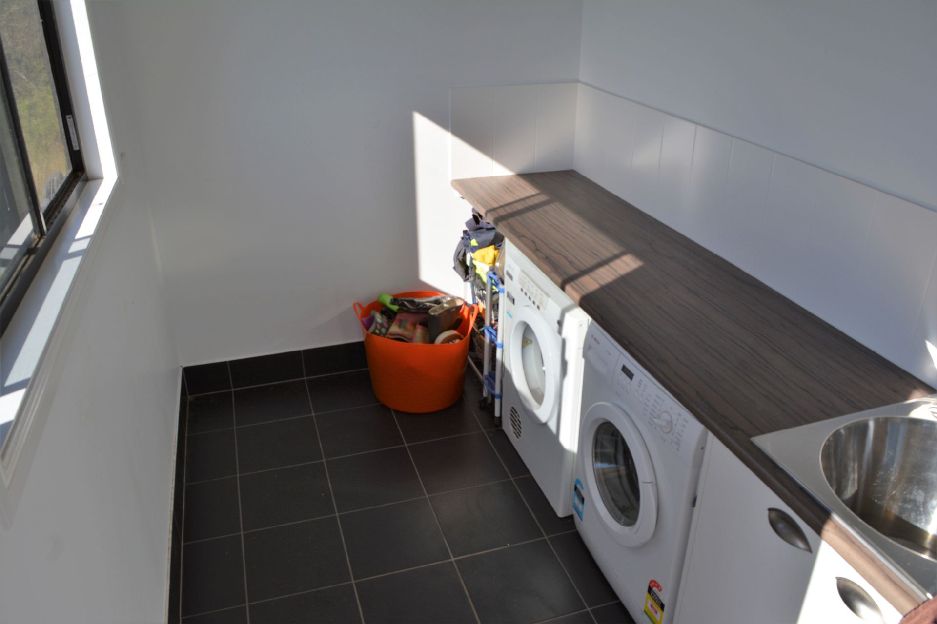 Laundry is separate and a great size with plenty of shelving room.