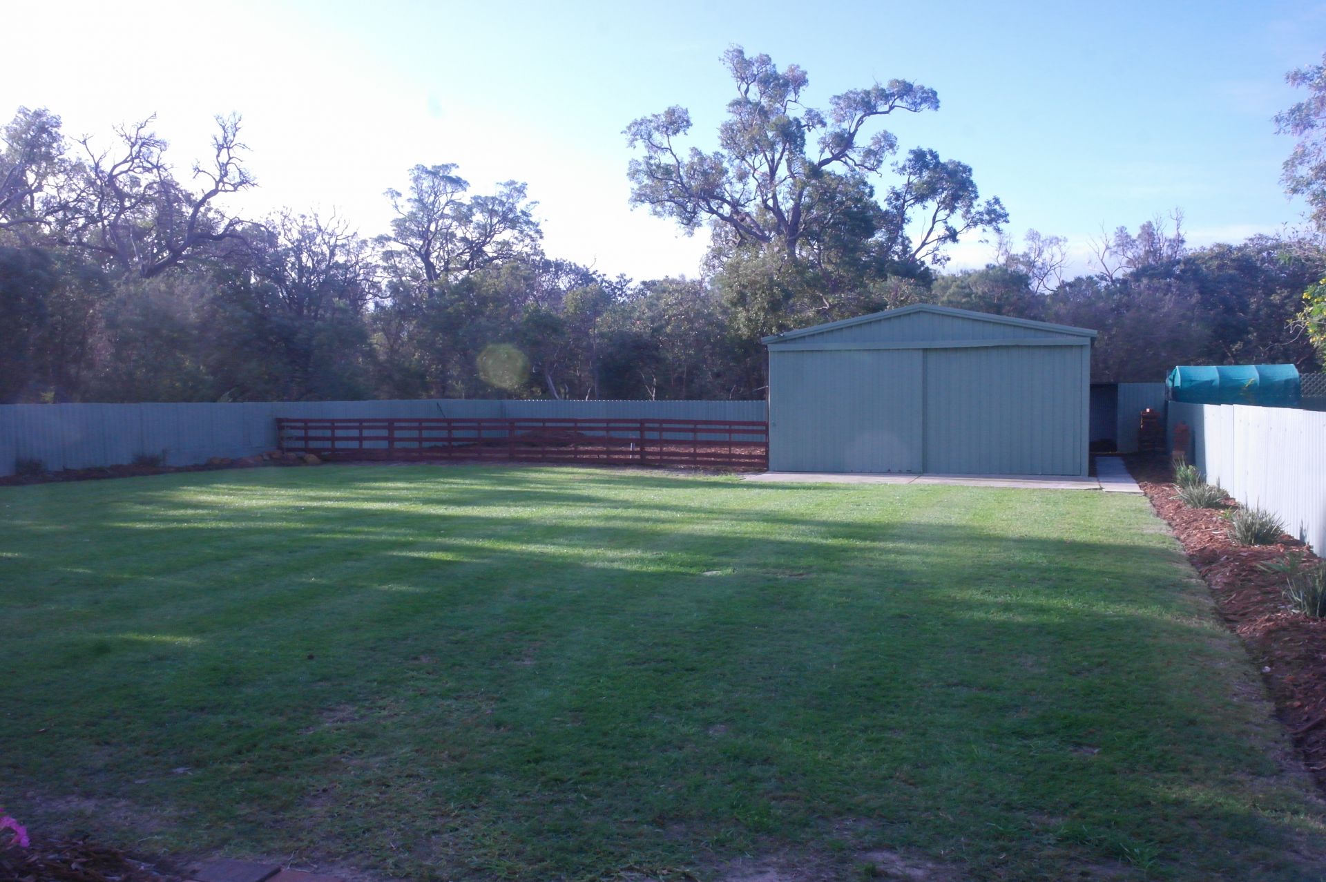 Great blank canvas garden with reticulated lawn area safe and secure for Kids and animals and ready to plant the rear fenced Vege patch and introduce your new chickens.