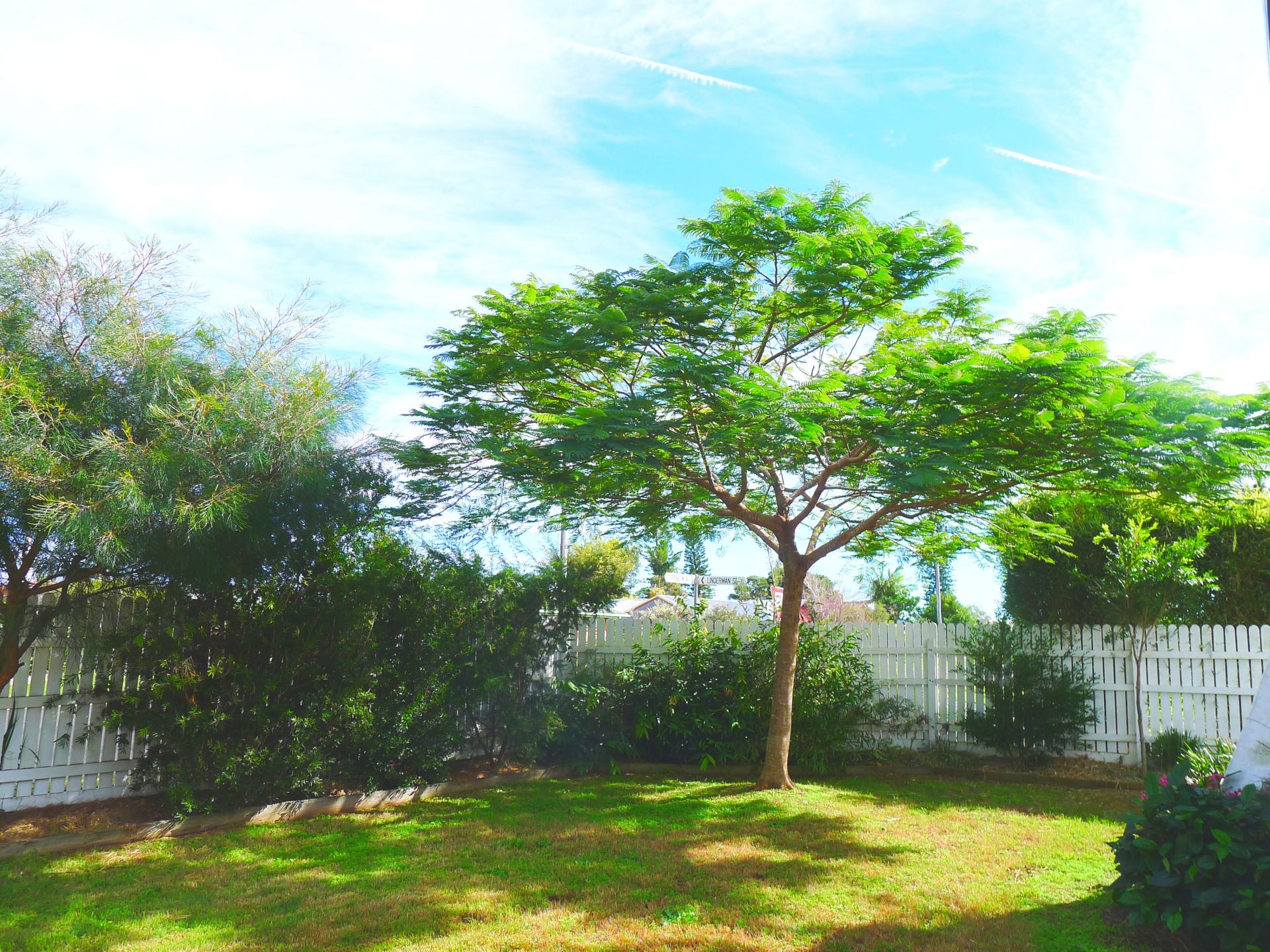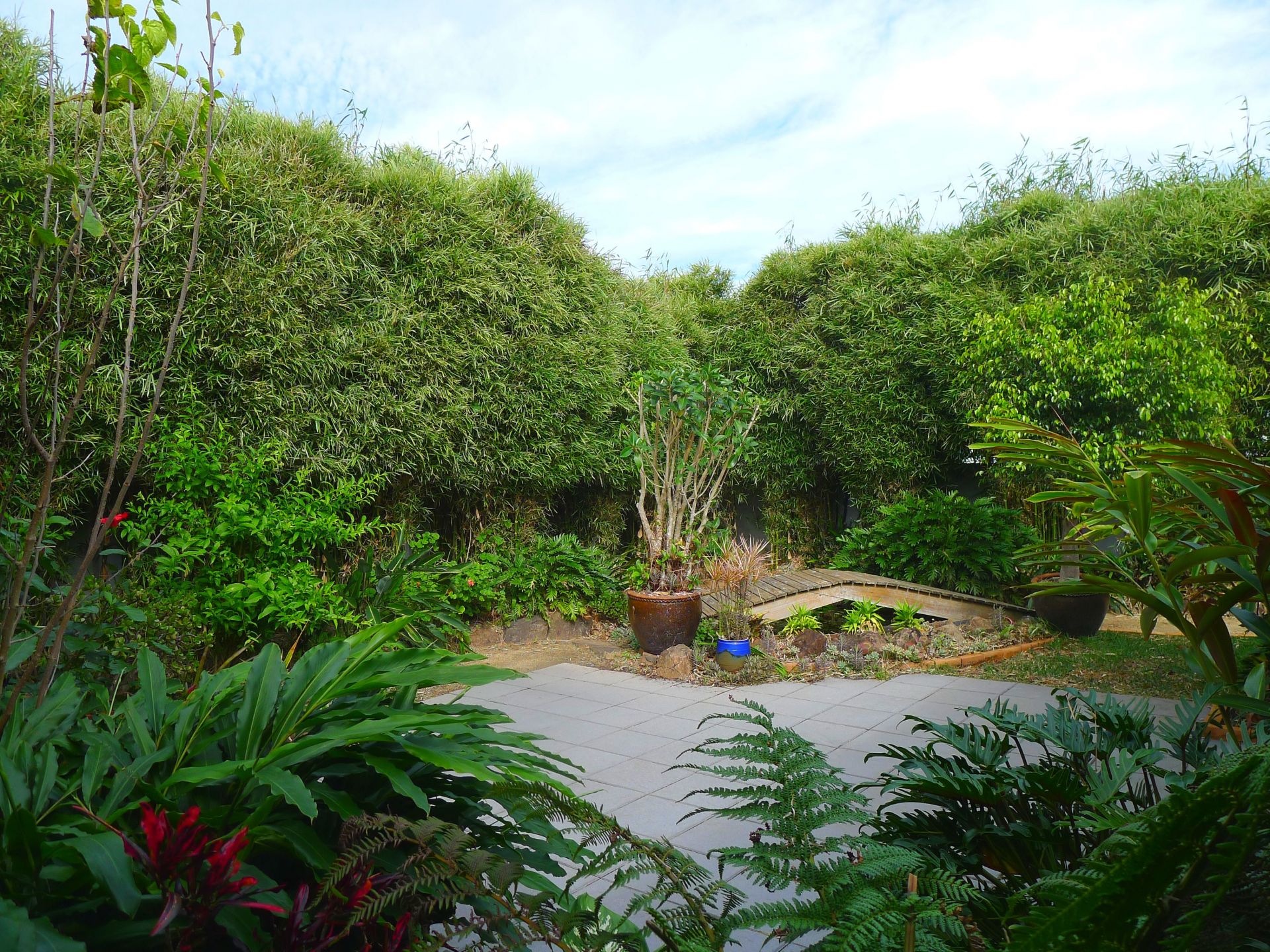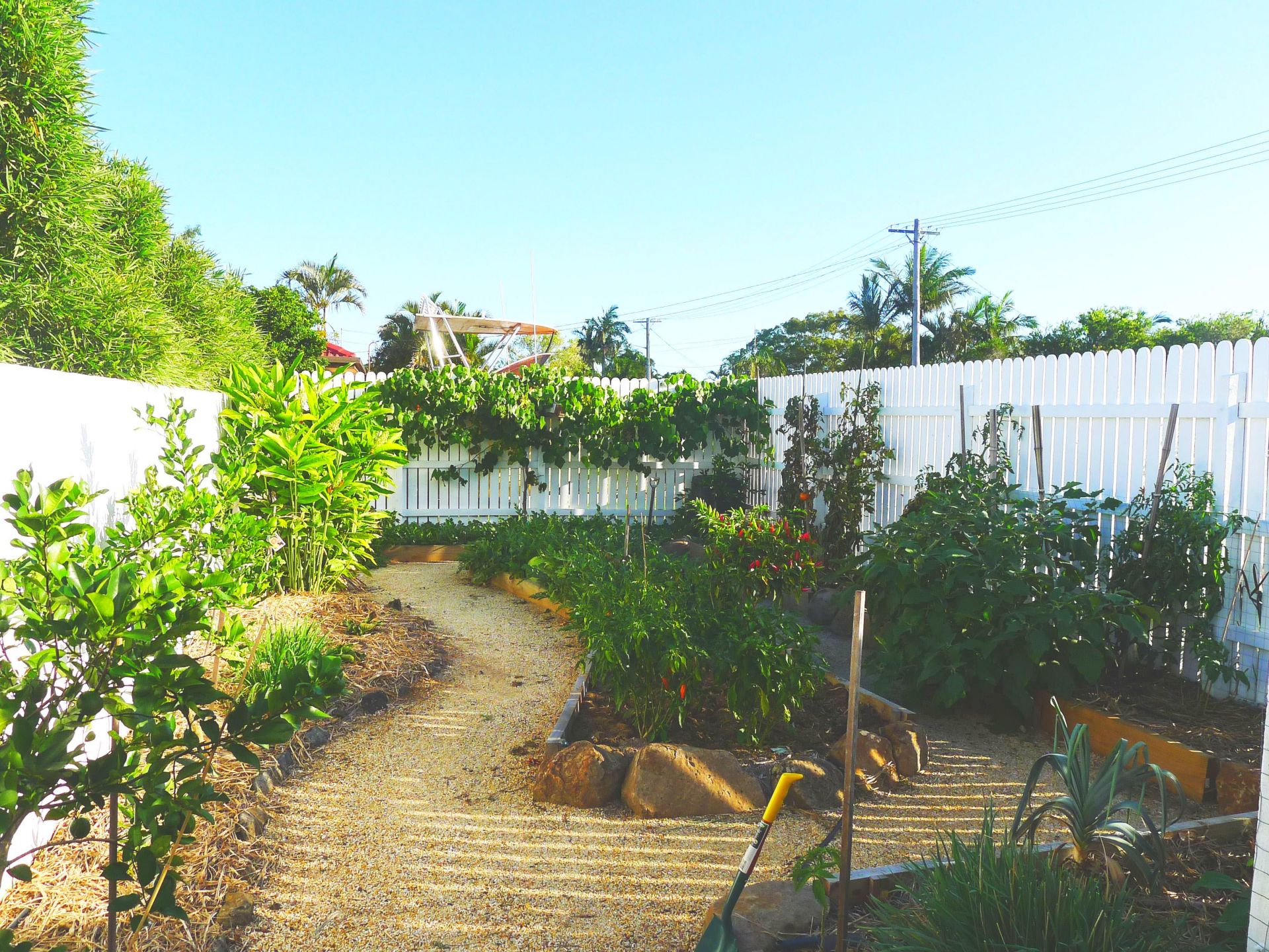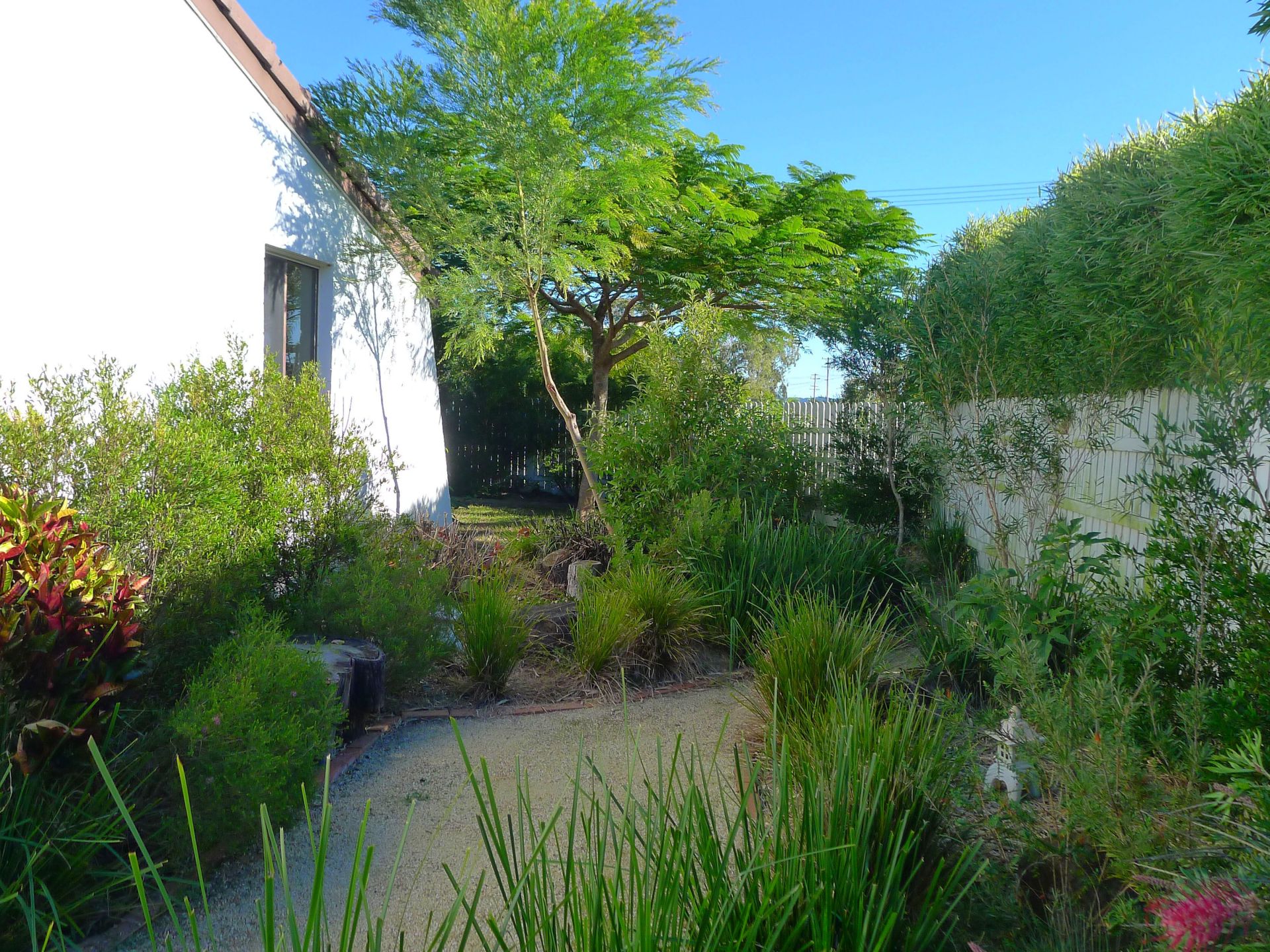 A large fully fenced yard with beautiful established gardens surrounding the home, including a private court yard and a productive garden.
