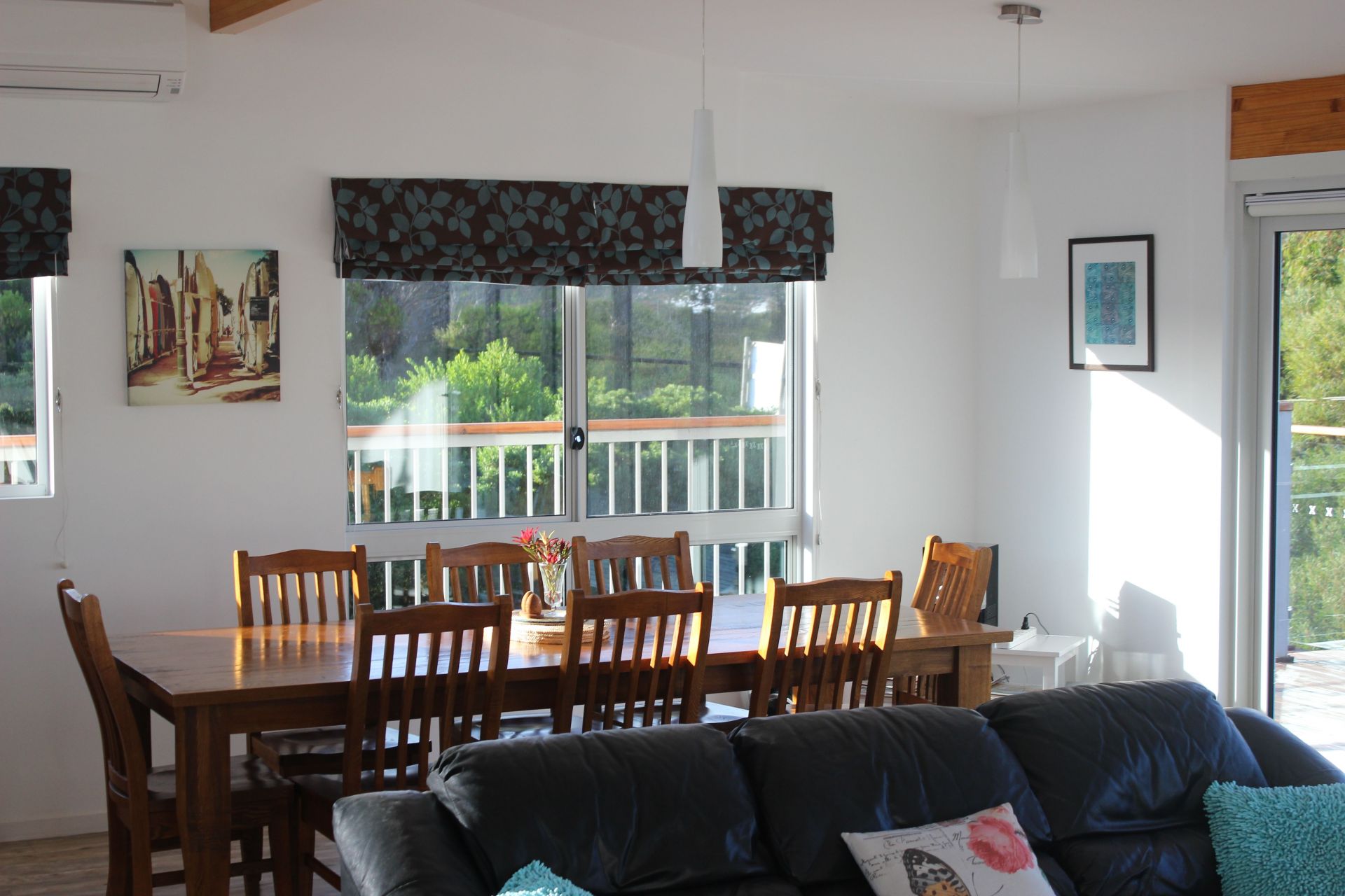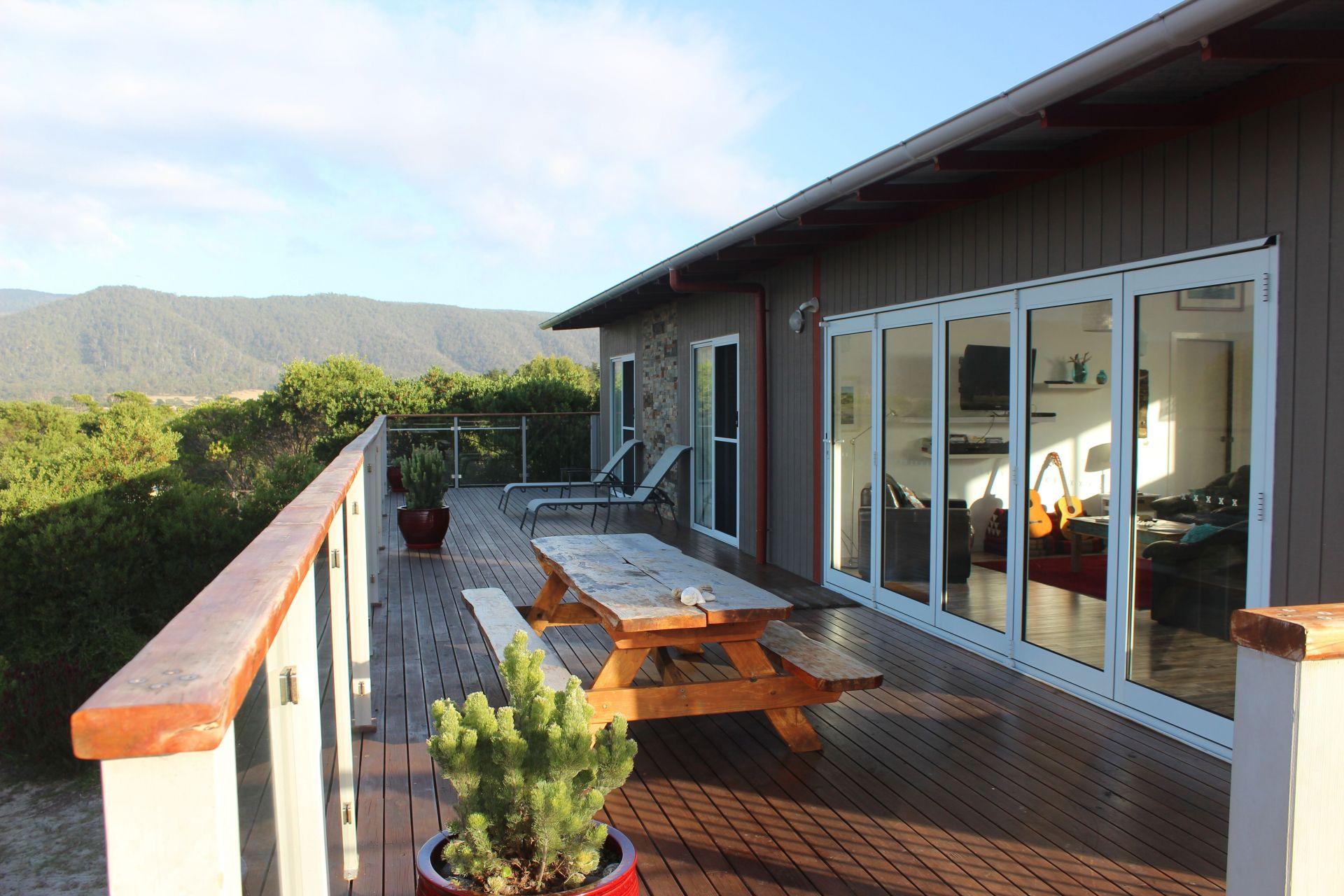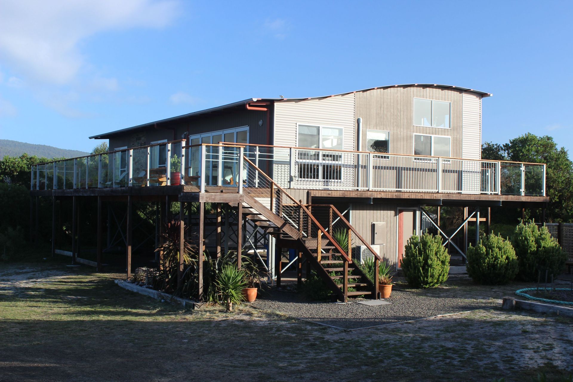 Seymour Waves offers lovely views of the coastline as well as the Douglas Apsley Ranges to the west. The building itself is a Shadowclad/Colourbond construction raised on steel piers to enhance the view with a wave-like sloping Colourbond roof. It features 3 double bedrooms with built-ins, each room having direct access to a deck, 2 bathrooms with showers, a laundry and a large living area. This main space has a vaulted ceiling with a spacious kitchen which includes a gas/electric range/oven, pantry, polished granite benches plus all the necessary whitegoods and appliances.