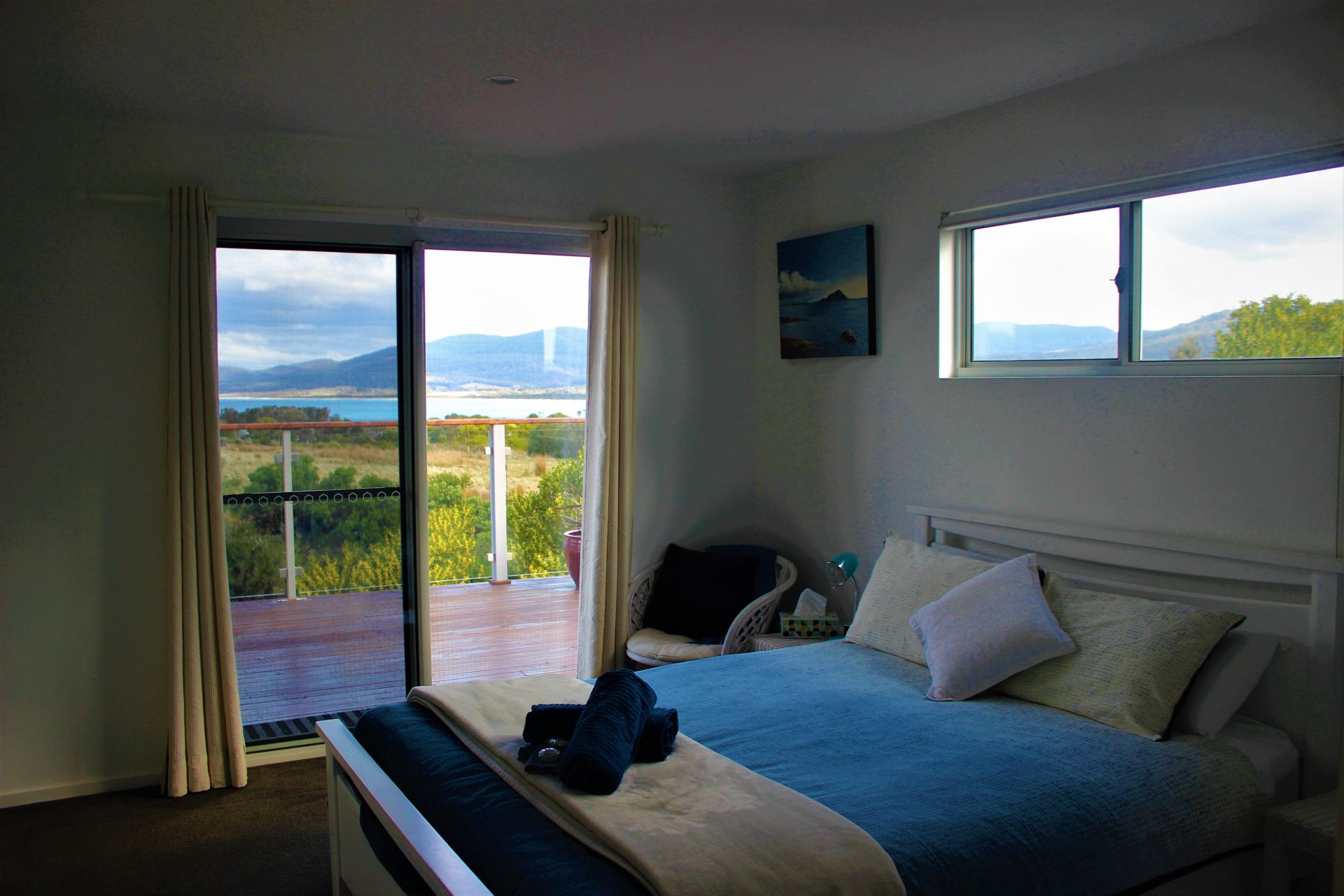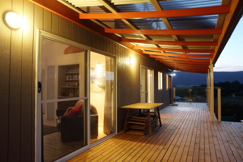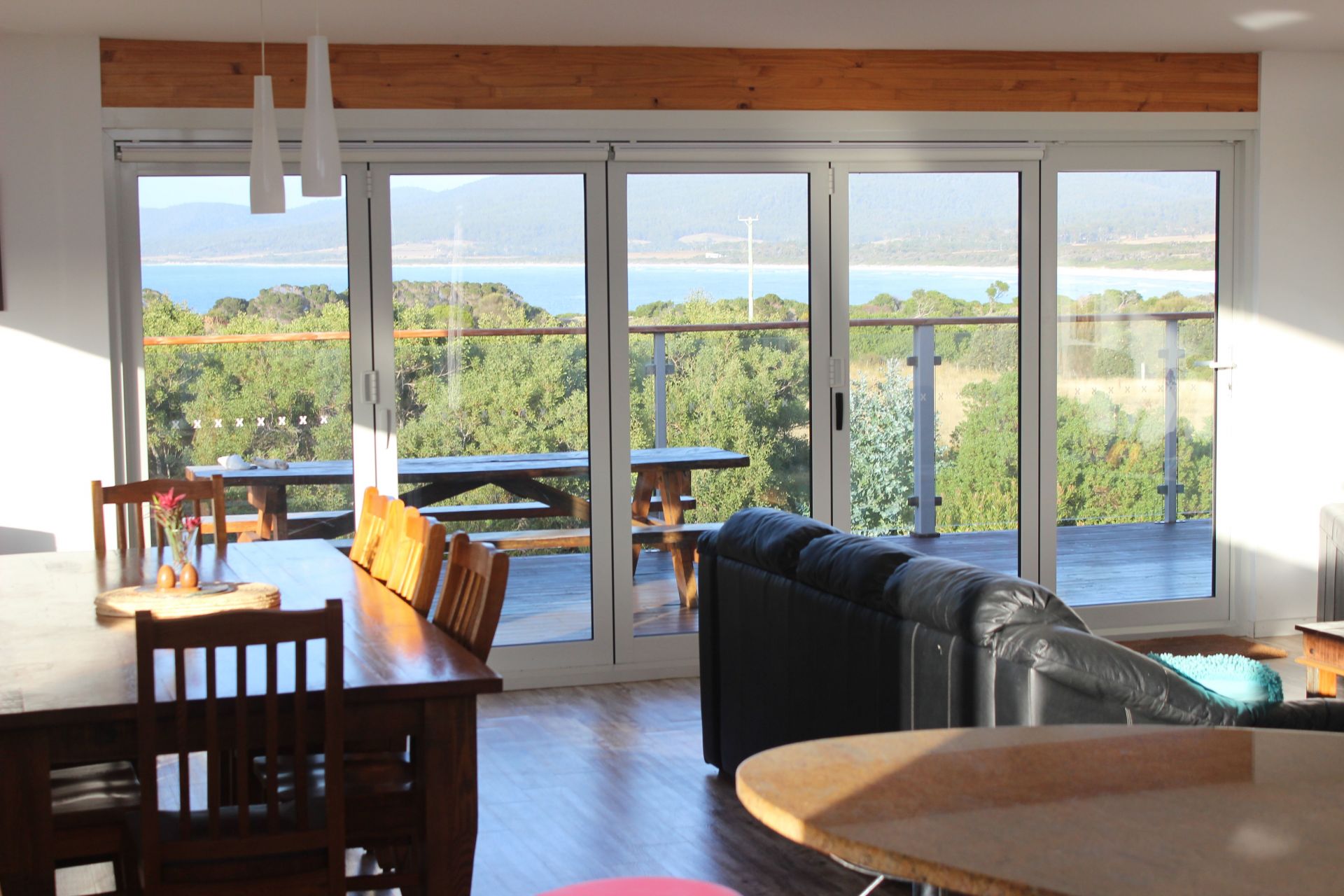 Seymour Waves offers lovely views of the coastline as well as the Douglas Apsley Ranges to the west. The building itself is a Shadowclad/Colourbond construction raised on steel piers to enhance the view with a wave-like sloping Colourbond roof. It features 3 double bedrooms with built-ins, each room having direct access to a deck, 2 bathrooms with showers, a laundry and a large living area. This main space has a vaulted ceiling with a spacious kitchen which includes a gas/electric range/oven, pantry, polished granite benches plus all the necessary whitegoods and appliances.