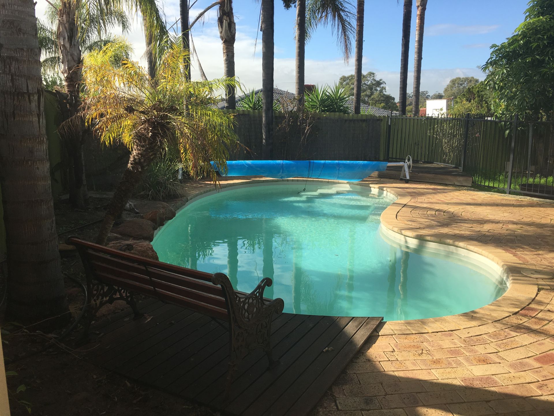 Large below ground salt and chlorine pool equipped with solar heating for extended swimming seasons.