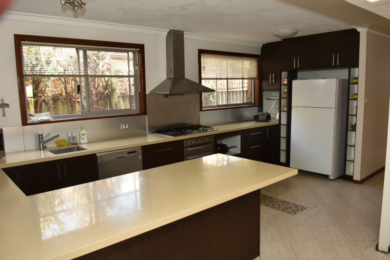 Massive chefs kitchen/dining with caesar stone bench tops, gas hotplates and electric oven.