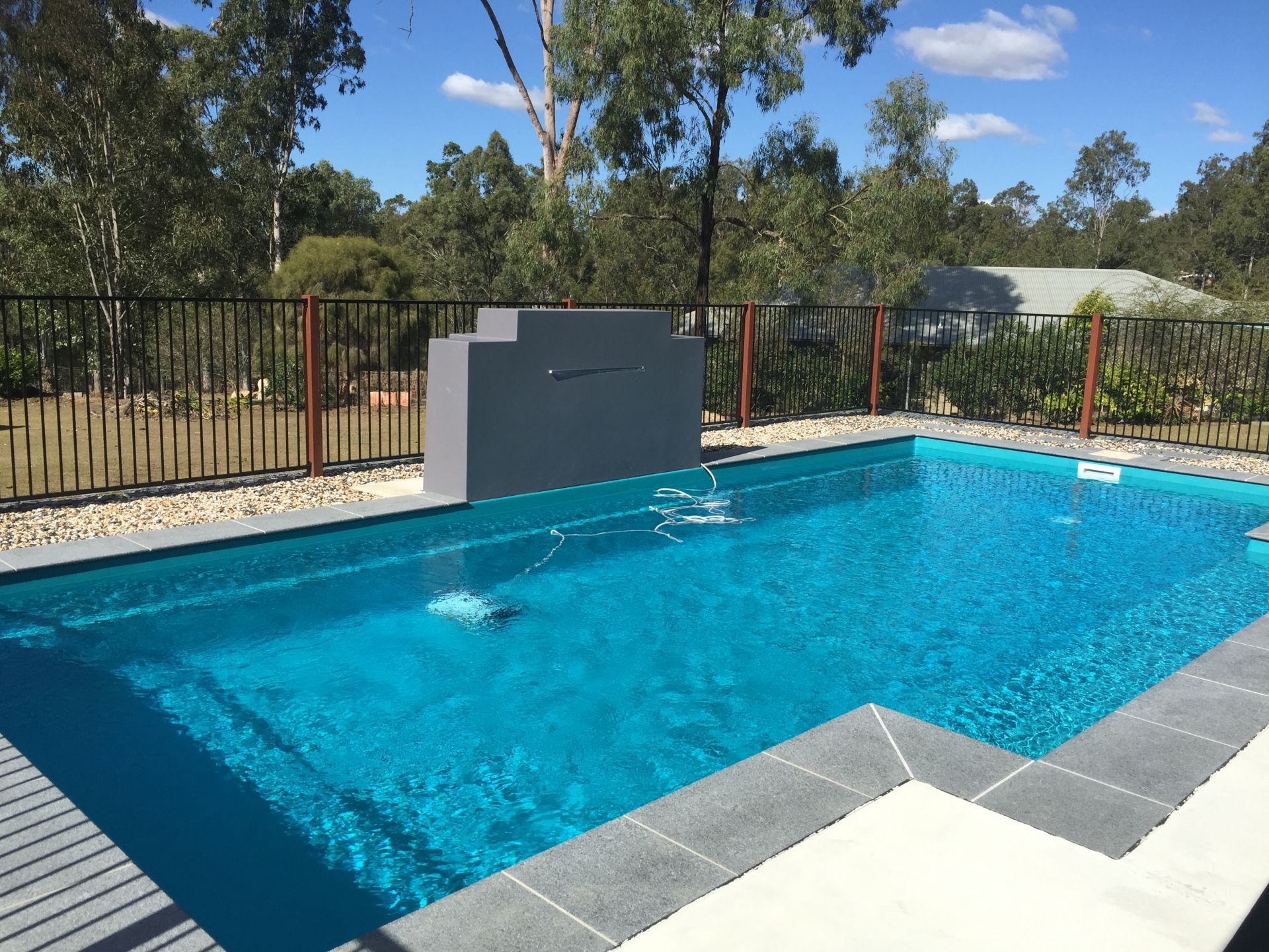 * 1 year old Inground Precision Fibreglass Saltwater Swimming Pool with Waterfall & Lighting with Remote.