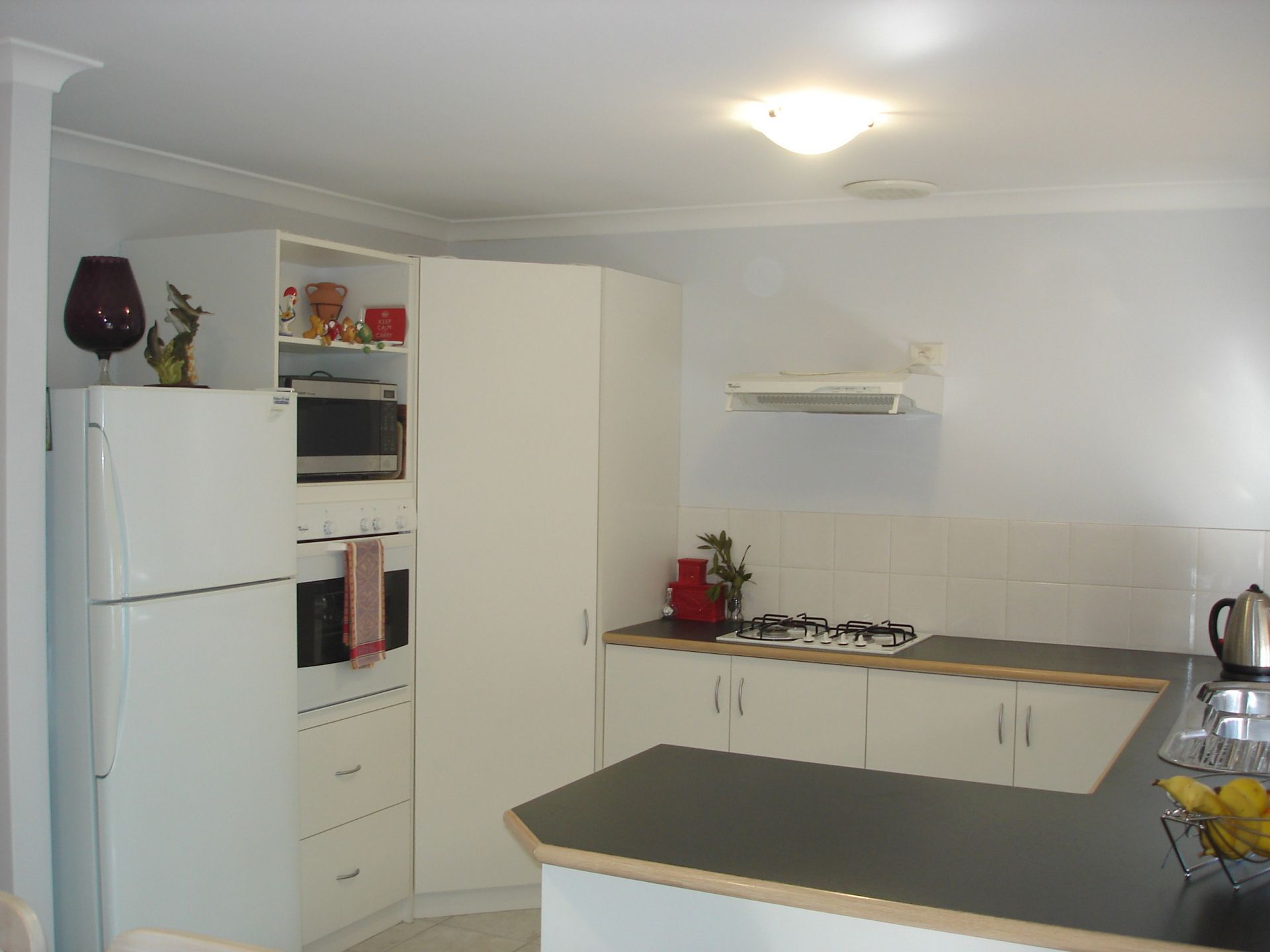 Kitchen includes a large pantry, gas cooktop with electric wall oven and recesses for microwave and dishwasher.