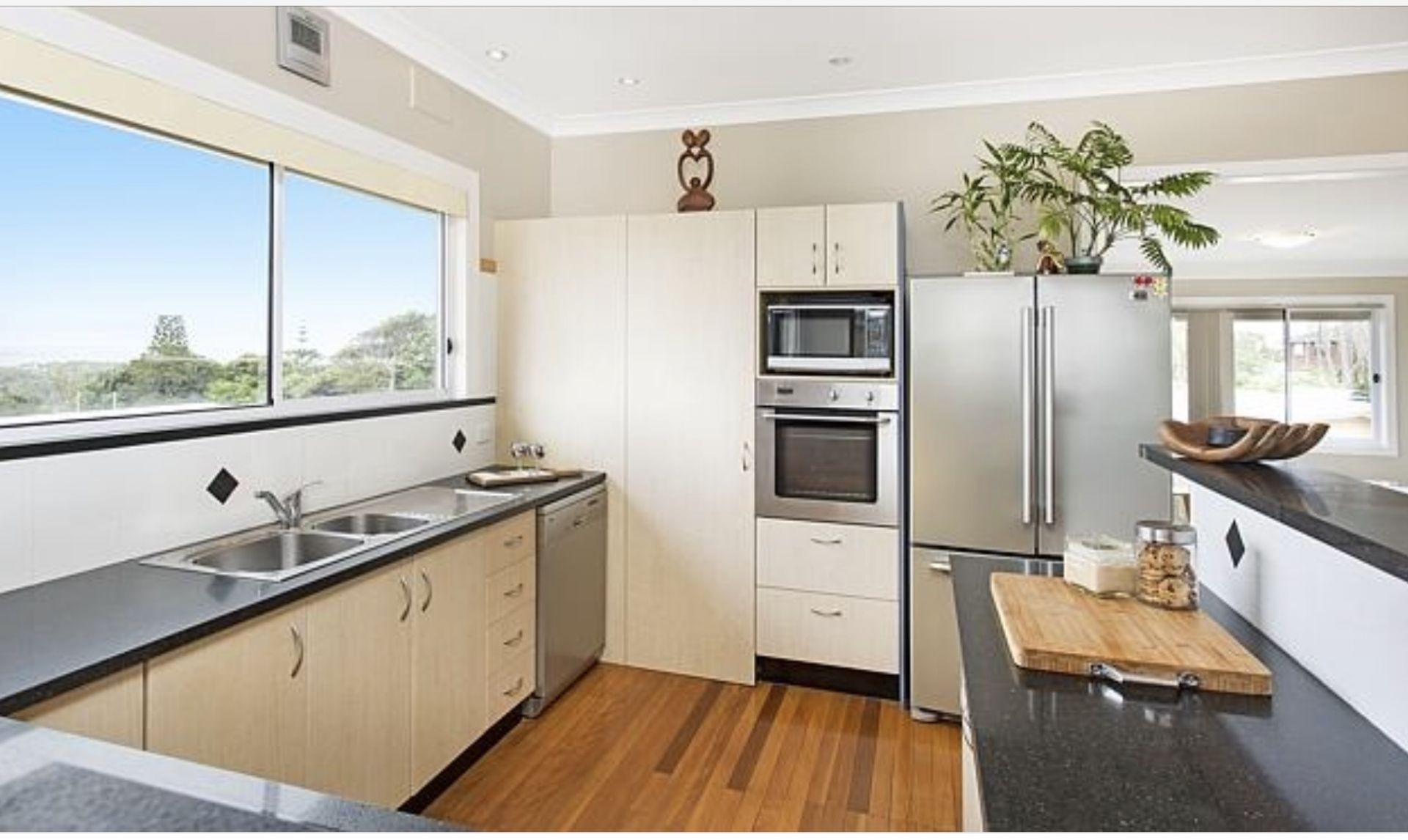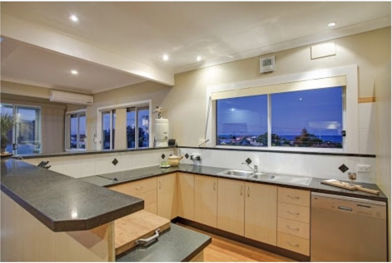 Spacious open plan living is over looked by a large kitchen with stainless steel appliance and striking black stone bench tops.